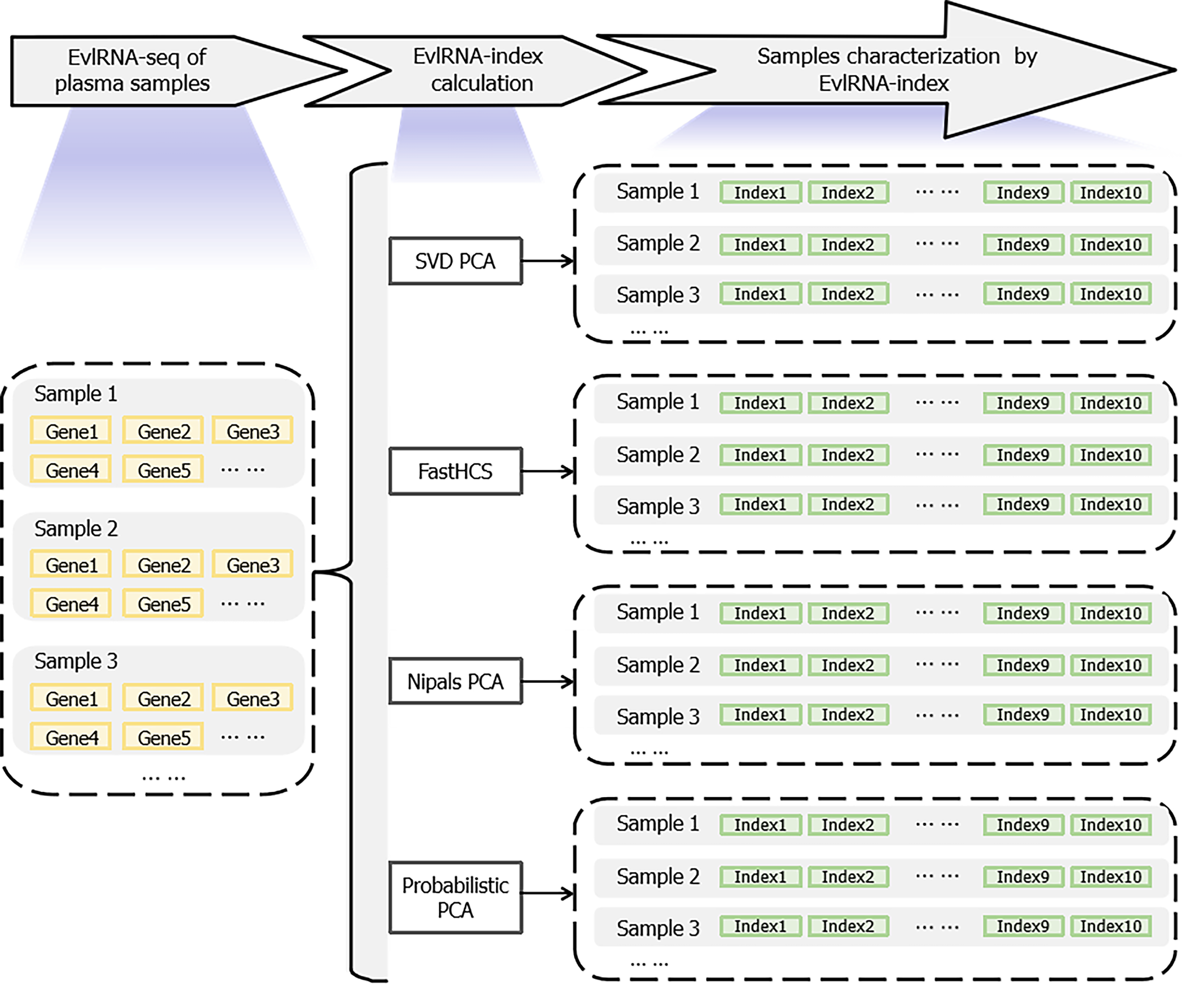 EvlRNA: Extracellular vesicle long RNA; SVD: Singular value decomposition; PCA: Principal component analysis; FastHCS: High-dimensional congruent subsets; Nipals: Nonlinear iterative partial least squares.