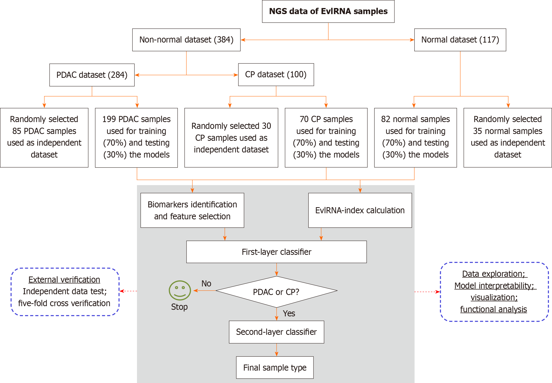 NGS: Next-generation sequencing; EvlRNA: Extracellular vesicle long RNA; PDAC: Pancreatic ductal adenocarcinoma; CP: Chronic pancreatitis.