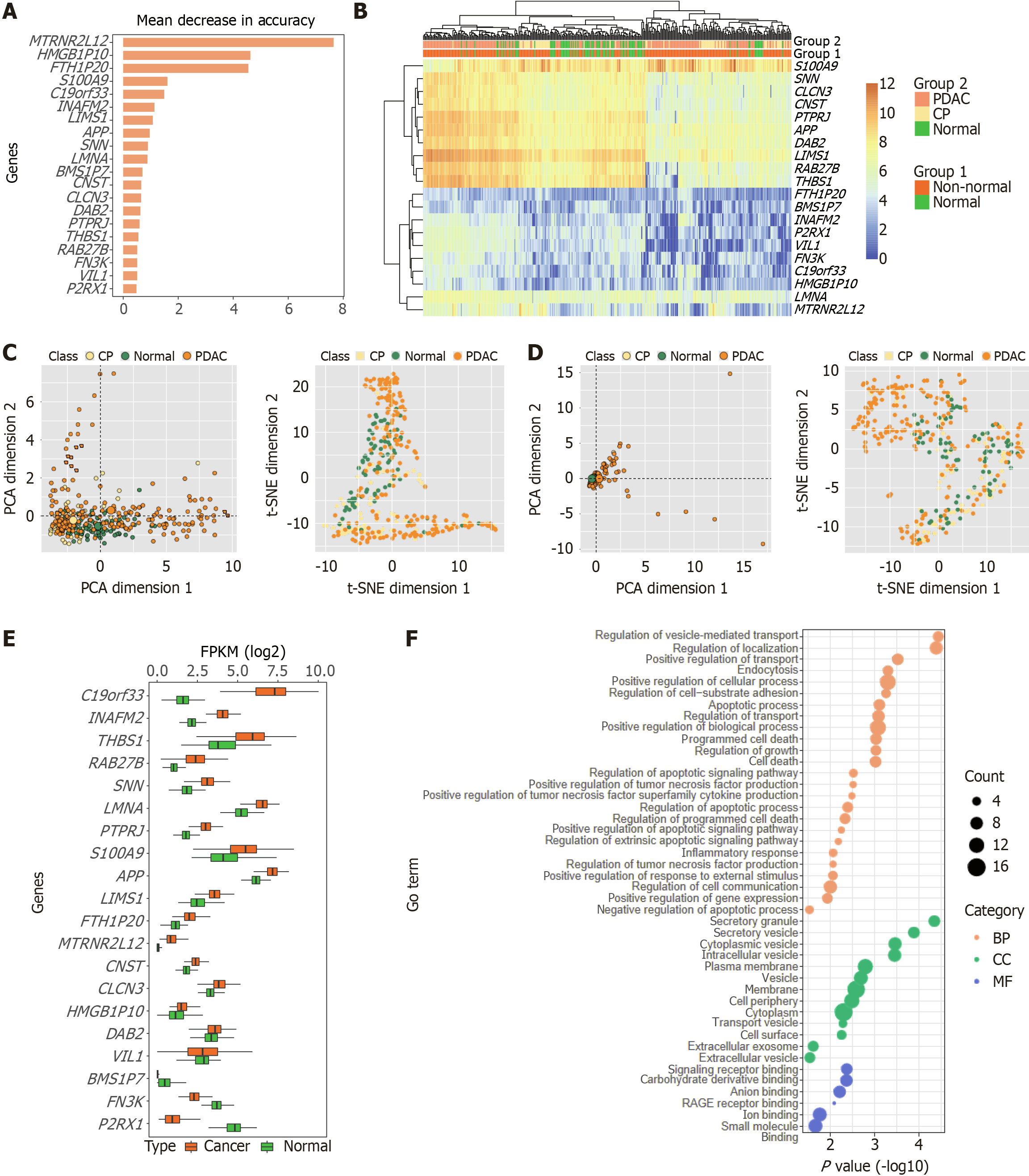 A: Feature (gene set) selection with mean decrease in accuracy; B: Heatmap analysis of the selected biomarkers (20 genes); C: Principal component analysis and t-distributed stochastic neighbor embedding analysis based on the extracellular vesicle long RNA expression of the selected biomarkers (20 genes); D: Principal component analysis and t-distributed stochastic neighbor embedding analysis based on the extracellular vesicle long RNA expression of the eight genes screened by Yu et al[25]; E: Gene expression analysis of potential biomarkers was performed using RNA-seq data from the The Cancer Genome Atlas and Genotype-Tissue Expression databases, which included 178 pancreatic ductal adenocarcinoma tissue samples and 171 normal pancreatic tissue samples; F: Gene Ontology analysis of 20 genes (potential biomarkers). PDAC: Pancreatic ductal adenocarcinoma; CP: Chronic pancreatitis; PCA: Principal component analysis; t-SNE: T-distributed stochastic neighbor embedding; FPKM: Fragments per kilobase of exon per million mapped fragments; GO: Gene Ontology; RAGE: Receptor for advanced glycation end products; BP: Biological process; CC: Cellular component; MF: Molecular function.