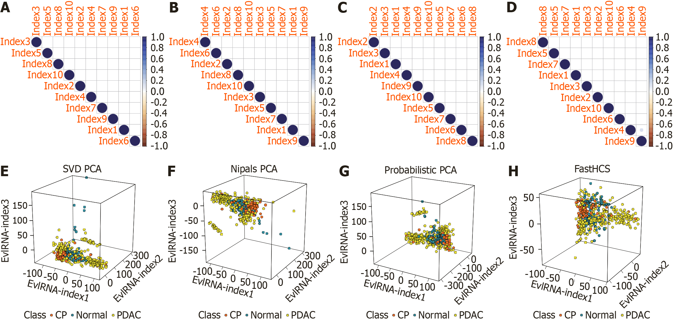 A: Correlation analysis of extracellular vesicle long RNA (EvlRNA)-index calculated based on singular value decomposition principal component analysis (PCA) algorithm; B: Correlation analysis of EvlRNA-index calculated based on nonlinear iterative partial least squares PCA algorithm; C: Correlation analysis of EvlRNA-index calculated based on Probabilistic PCA algorithm; D: Correlation analysis of EvlRNA-index calculated based on FastHCS algorithm; E: Visualization of EvlRNA-index calculated by singular value decomposition PCA algorithm; F: Visualization of EvlRNA-index calculated by nonlinear iterative partial least squares PCA algorithm; G: Visualization of EvlRNA-index calculated by Probabilistic PCA algorithm; H: Visualization of EvlRNA-index calculated by FastHCS algorithm. SVD: Singular value decomposition; PCA: Principal component analysis; EvlRNA: Extracellular vesicle long RNA; PDAC: Pancreatic ductal adenocarcinoma; CP: Chronic pancreatitis; FastHCS: High-dimensional congruent subsets; Nipals: Nonlinear iterative partial least squares.