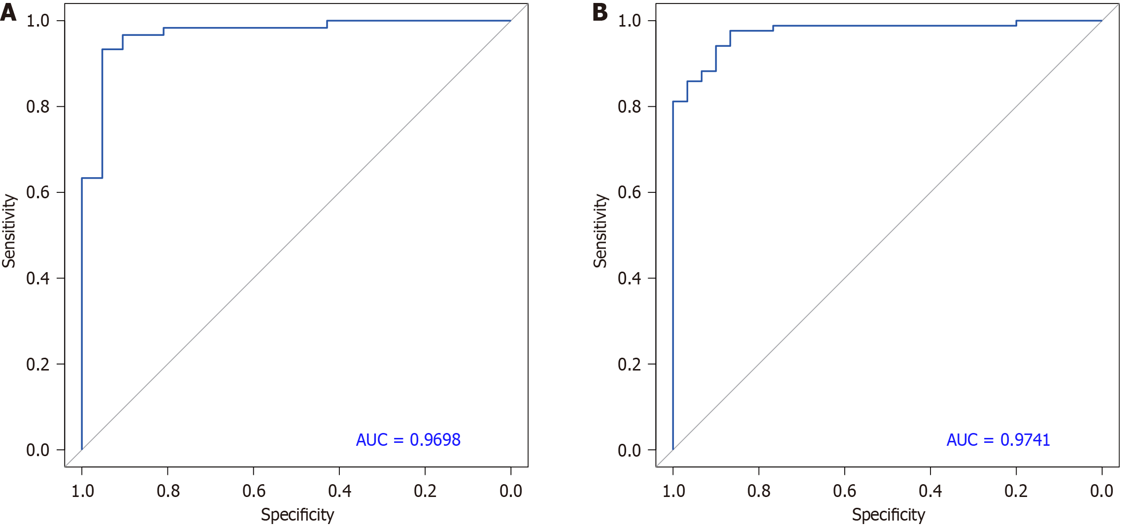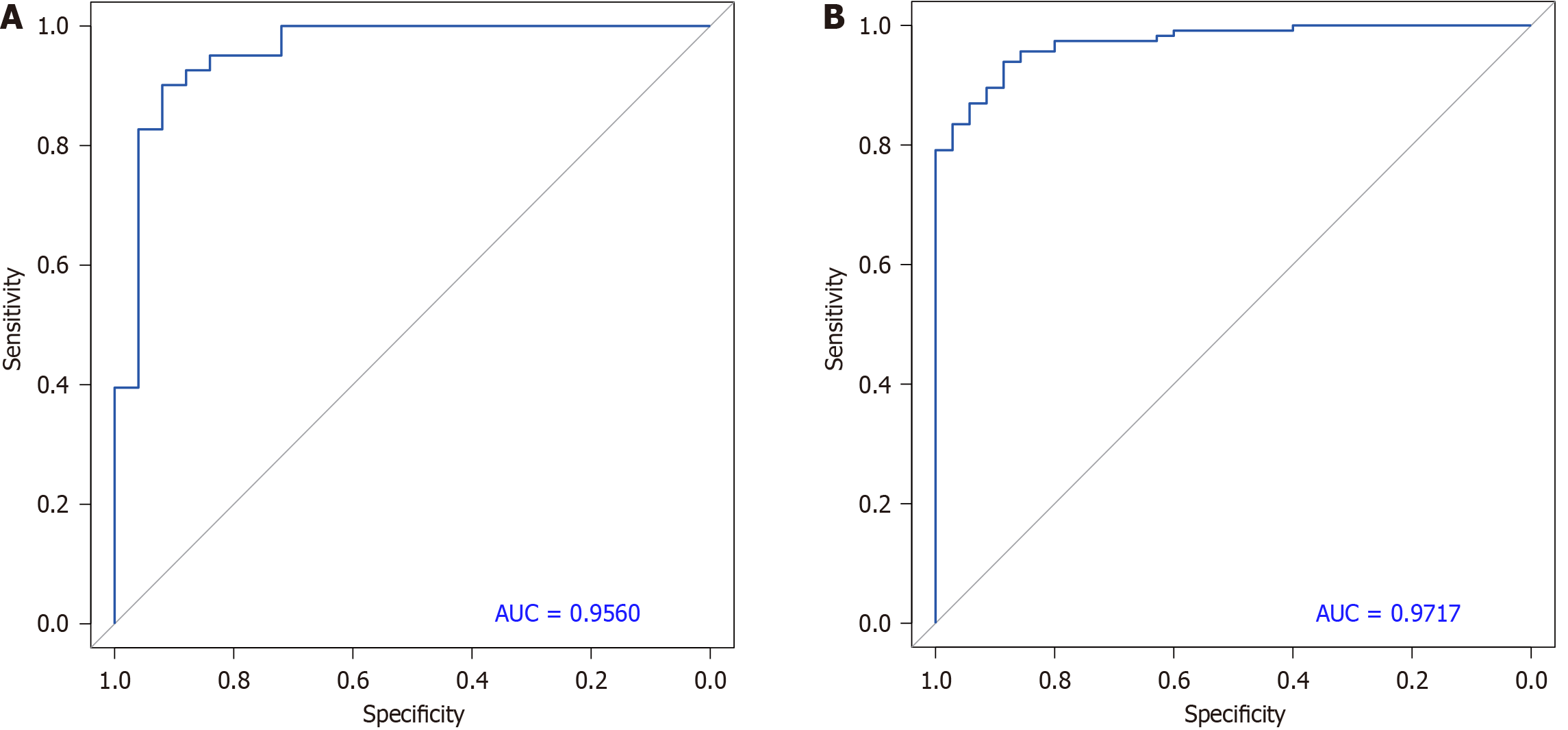 A: Based on training dataset; B: Based on the independent dataset. AUC: Area under the receiver operating characteristic curve.