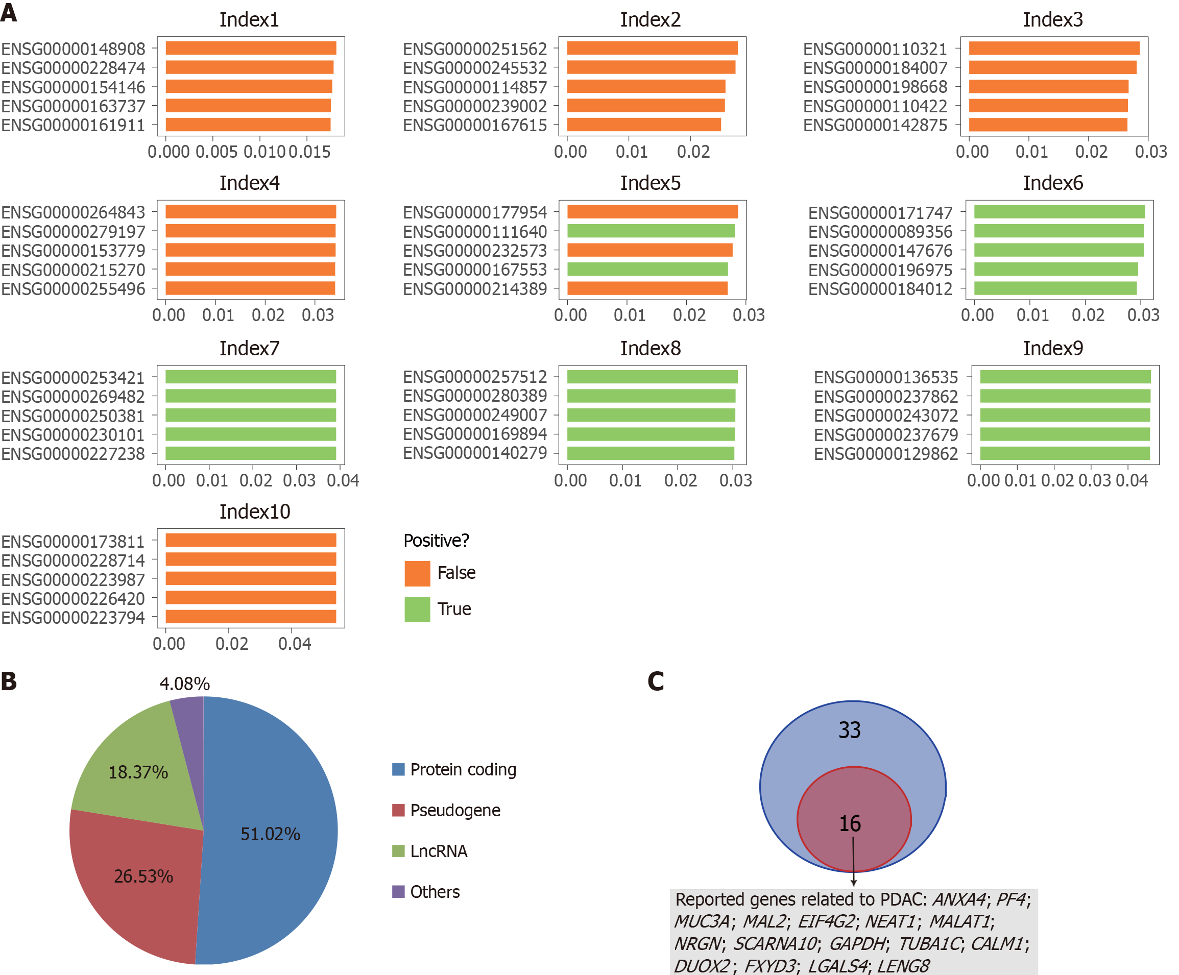 A: The top five genes in terms of weight in each probabilistic principal component analysis-based extracellular vesicle long RNA index calculation process; B: Classification of gene types; C: The 49 pancreatic ductal adenocarcinoma cancer-related genes identified in this study were compared with those reported in the literature. PDAC: Pancreatic ductal adenocarcinoma; lncRNA: Long non-coding RNA.