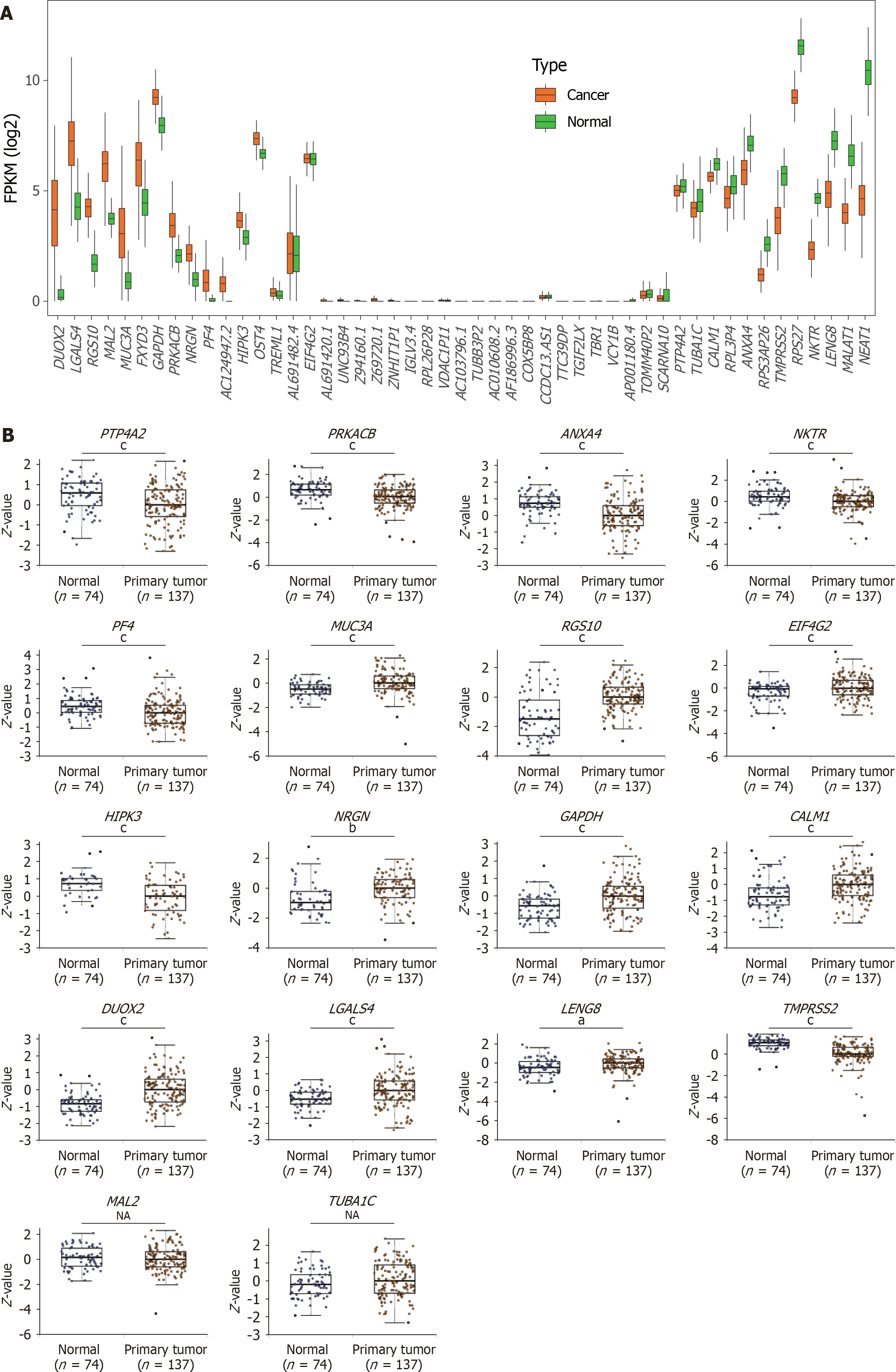 A: Expression of selected genes was performed using RNA-seq data from The Cancer Genome Atlas and Genotype-Tissue Expression databases; B: Protein expression of encoding protein genes in normal and primary pancreatic ductal adenocarcinoma tissues based on the clinical proteomic tumor analysis consortium dataset. FPKM: Fragments per kilobase of exon per million mapped fragments; NA: Not available. aP < 0.05, bP < 0.01, and cP < 0.001.