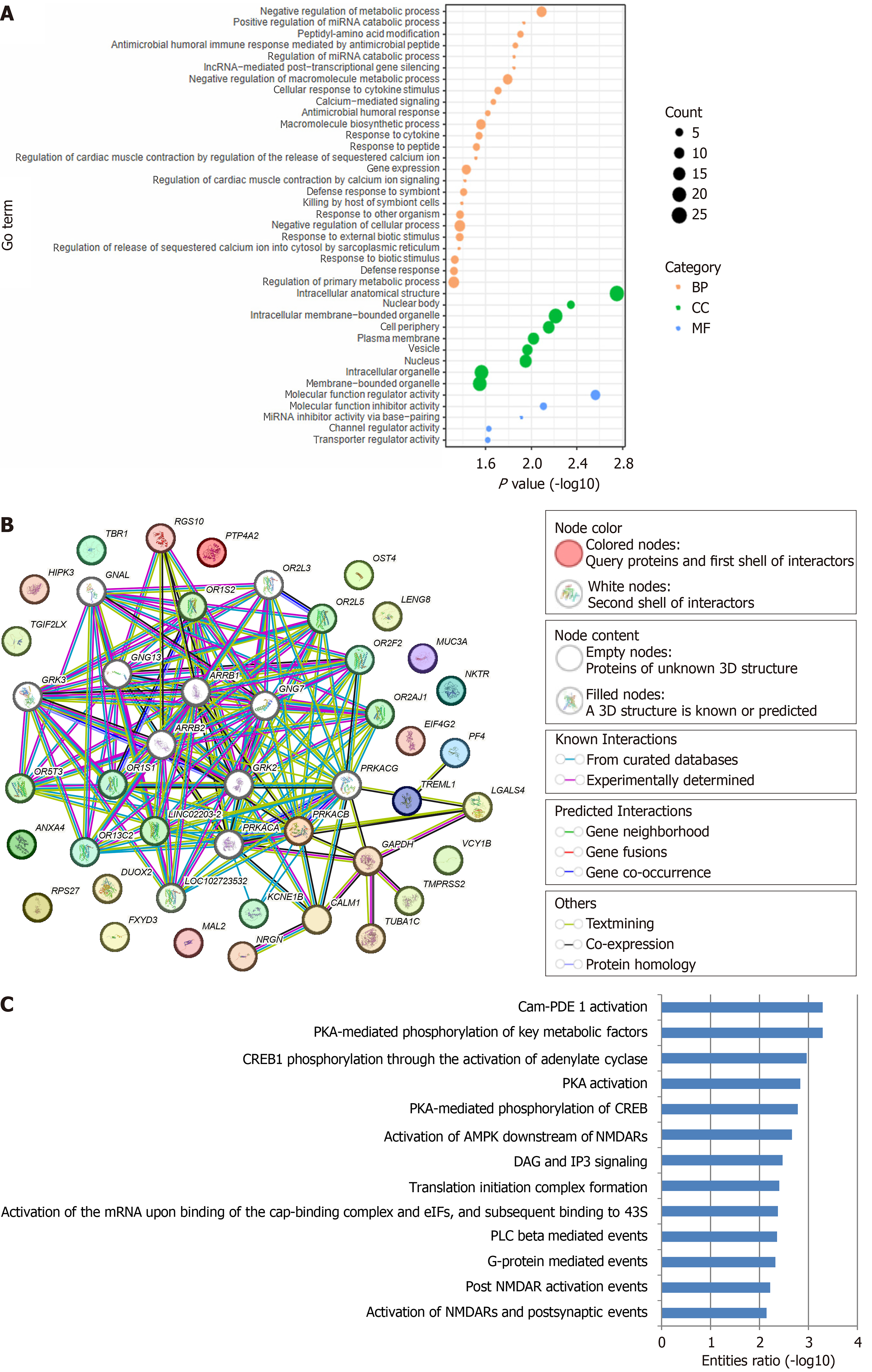 A: Gene Ontology analysis; B: Protein-protein interaction analysis (protein-protein interaction enrichment P value: < 1.0e-16), network nodes represent proteins, edges represent protein-protein associations; C: Pathway analysis. GO: Gene Ontology; miRNA: MicroRNA; lncRNA: Long non-coding RNA; Cam-PDE: Calmodulin-dependent phosphodiesterase; PKA: Protein kinase A; CREB1: CAMP response element-binding protein 1; AMPK: AMP-activated protein kinase; NMDARs: N-methyl-D-aspartate receptors; DAG: Diacylglycerol; IP3: Inositol 1,4,5-trisphosphate; eIFs: Eukaryotic initiation factors; PLC: Phospholipase C.