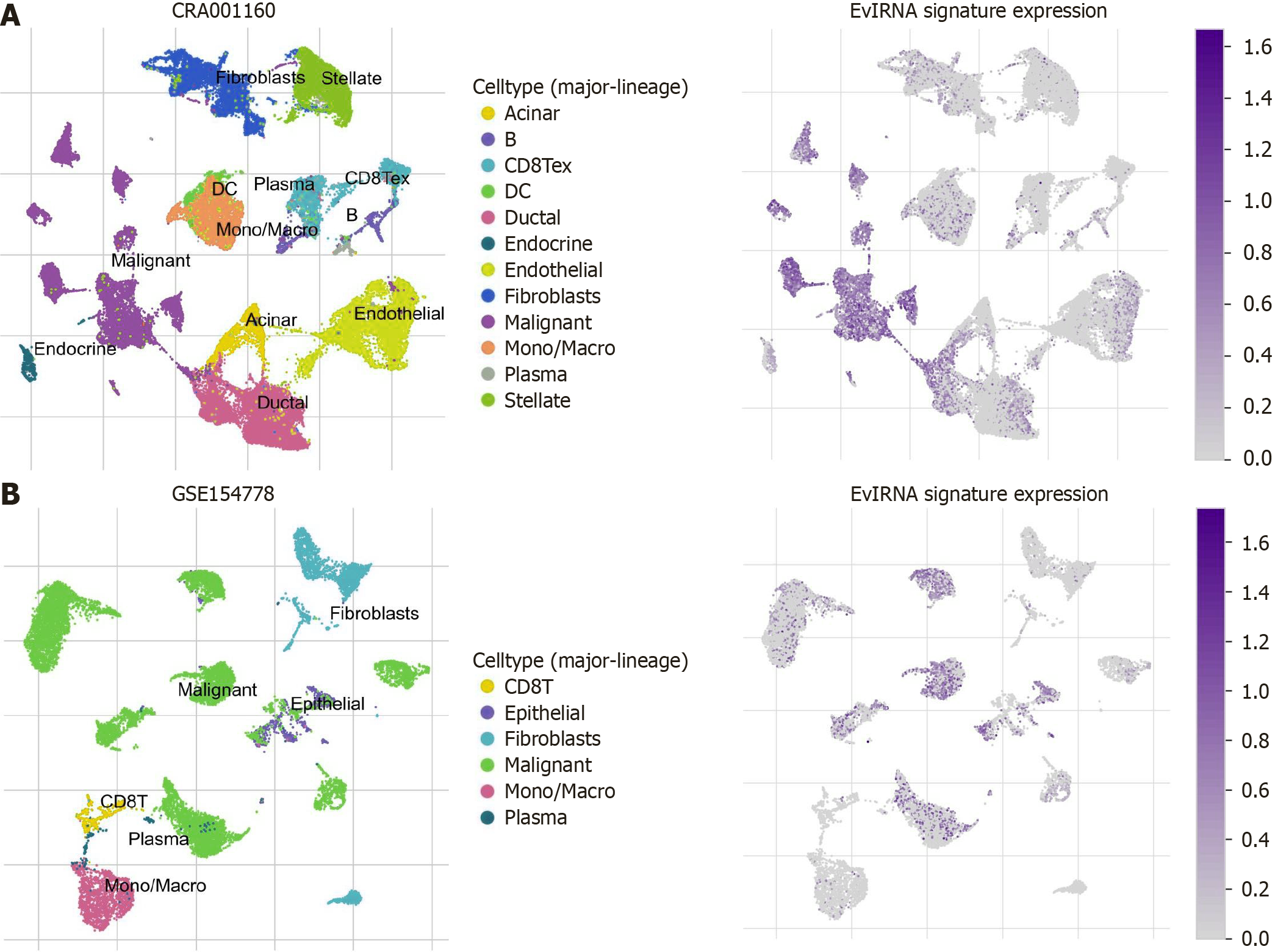 A: Based on CRA001160, number of cells: 57443; B: Based on GSE154778, number of cells: 14953. EvlRNA: Extracellular vesicle long RNA; CD8T: CD8+ T cell; DC: Dendritic cell; B: B cell.