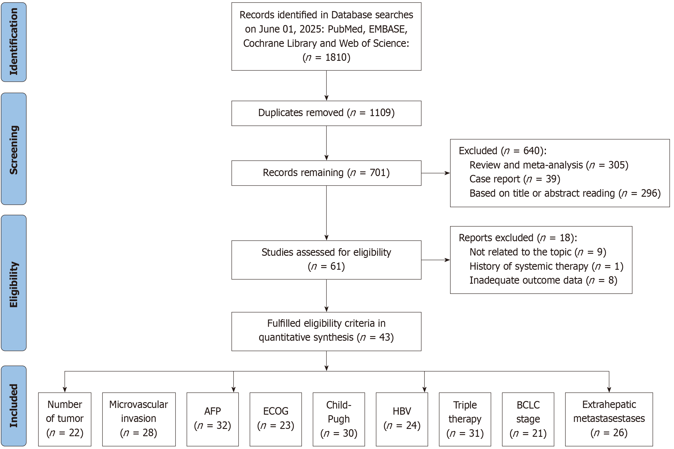 Figure 2 Literature search and screening process for prognostic risk factors associated with receiving transcatheter arterial chemoe mbolization in combination with lenvatinib for patients with unresectable hepatocellular carcinoma.