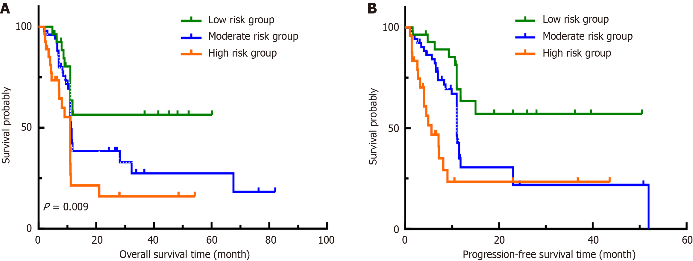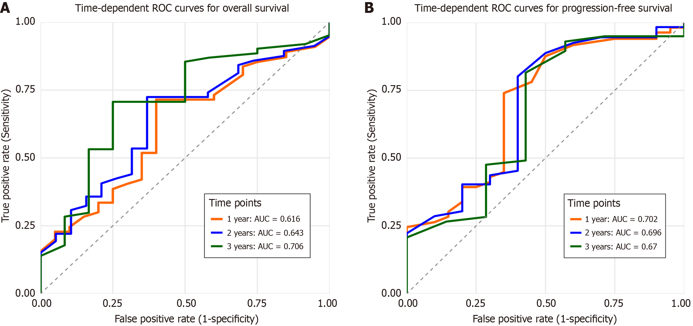 A: Overall survival; B: Progression-free survival. ROC: Receiver operating characteristic; AUC: Areas under the curve.