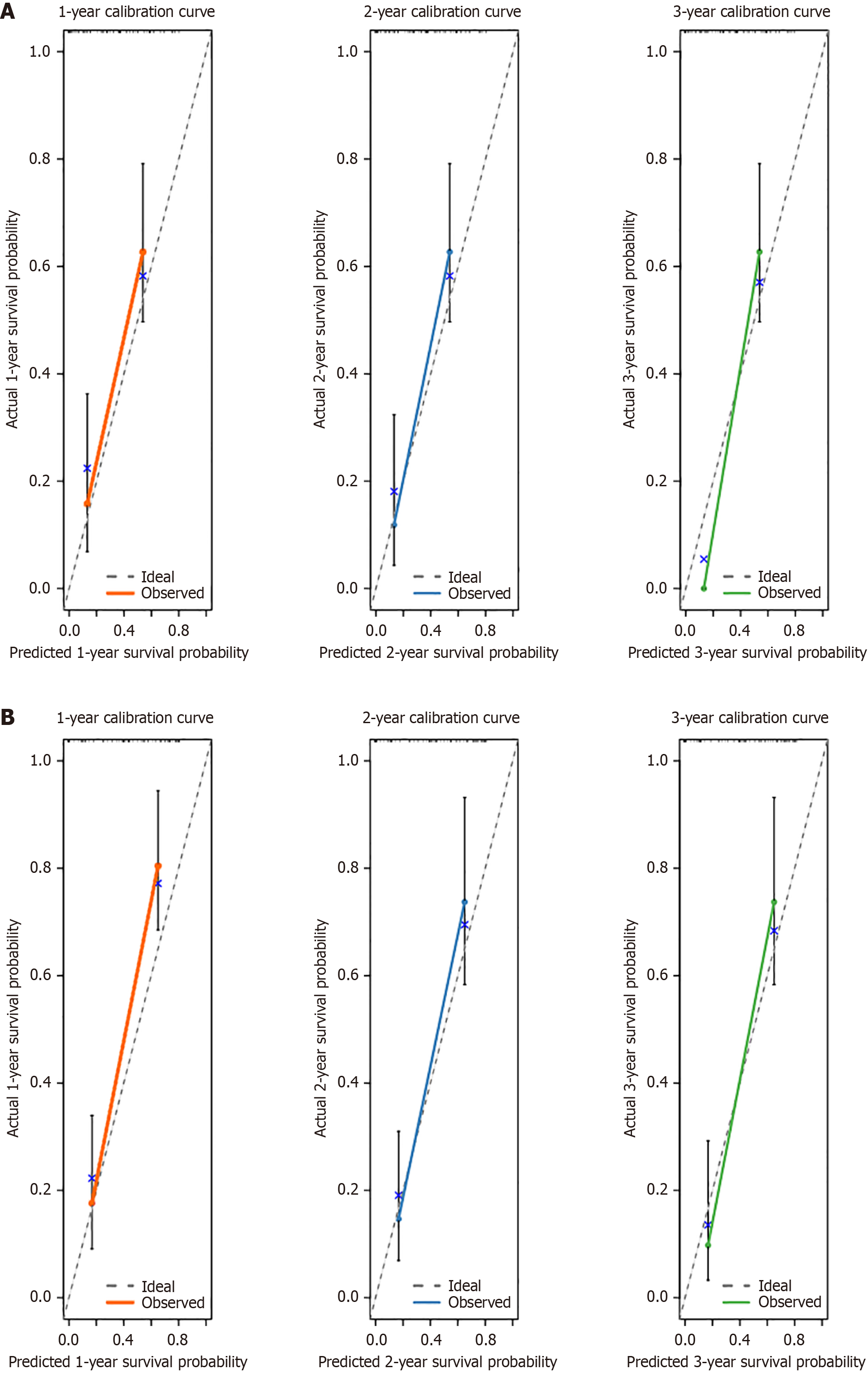 Figure 4 Prediction models for in the validation cohort, with 1-year, 2-year, and 3-year calibration curves.