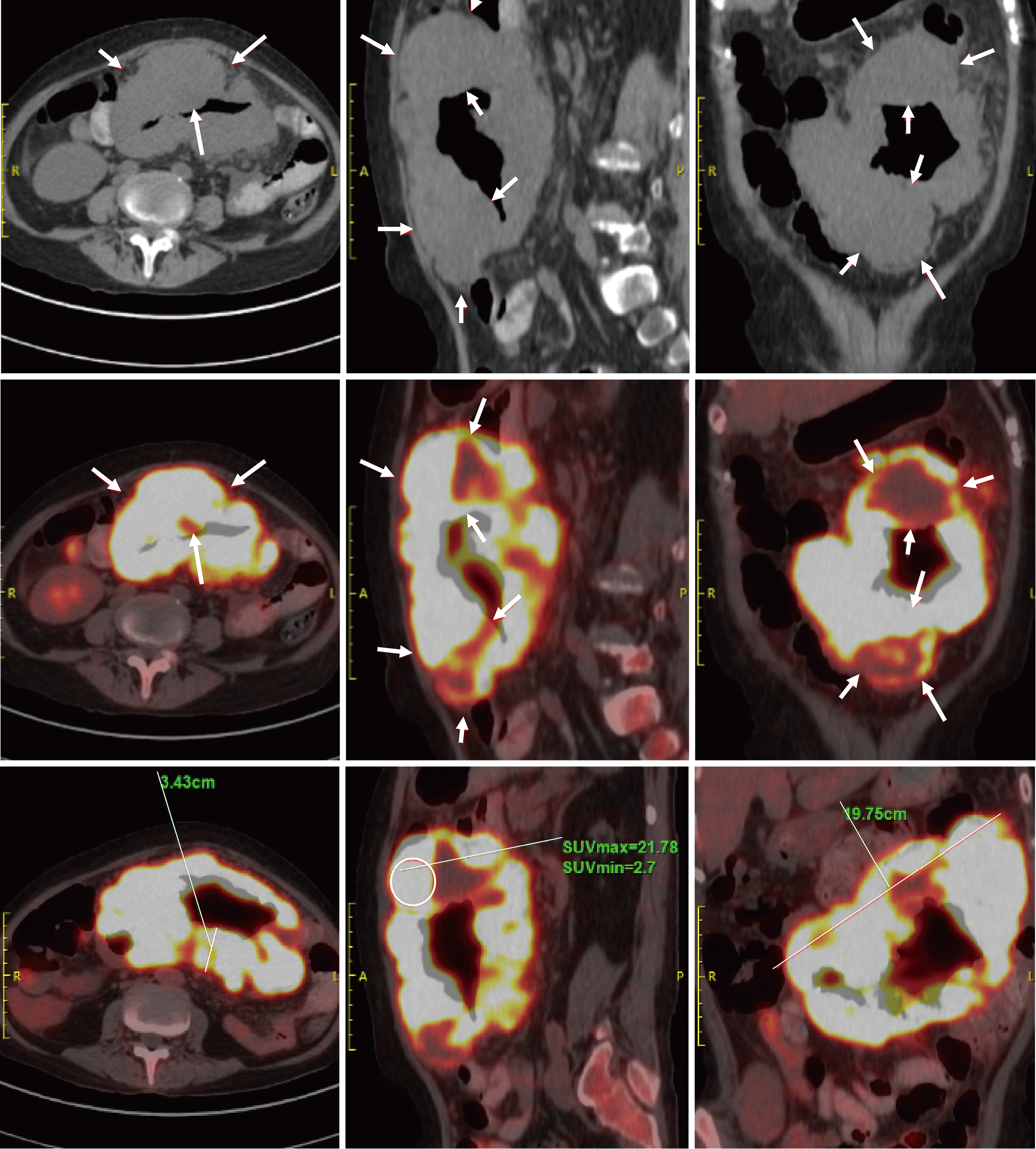 Segmental circumferential thickening and mass formation were noted in the second segment of the small intestine, extending from the left upper to mid-abdomen, with significantly increased fluorodeoxyglucose uptake. Multiple enlarged lymph nodes were observed in the abdominal cavity surrounding the small intestinal lesion, also demonstrating markedly elevated fluorodeoxyglucose uptake. Arrow: Segmental small bowel wall thickening and a mass, respectively. The circled areas highlight regions with increased fluorodeoxyglucose uptake. The solid lines mark the measured lengths.