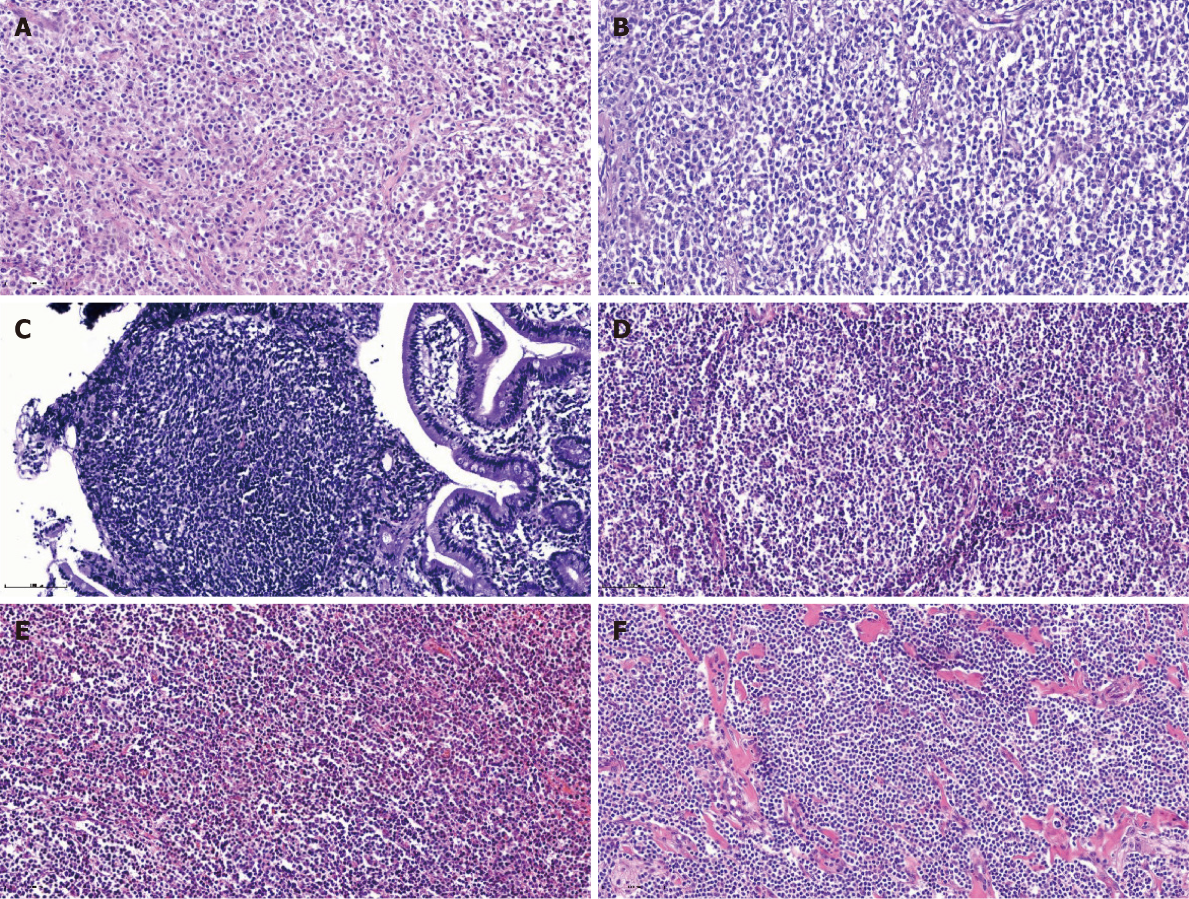 A: Gastric diffuse large B-cell lymphoma; B: Jejunal diffuse large B-cell lymphoma; C: Duodenal follicular lymphoma (low-grade, grade 1-2); D: Axillary follicular lymphoma (grade II); E: Intestinal monomorphic T-cell lymphoma of the small intestine; F: Small intestinal extranodal marginal zone lymphoma of mucosa-associated lymphoid tissue.
