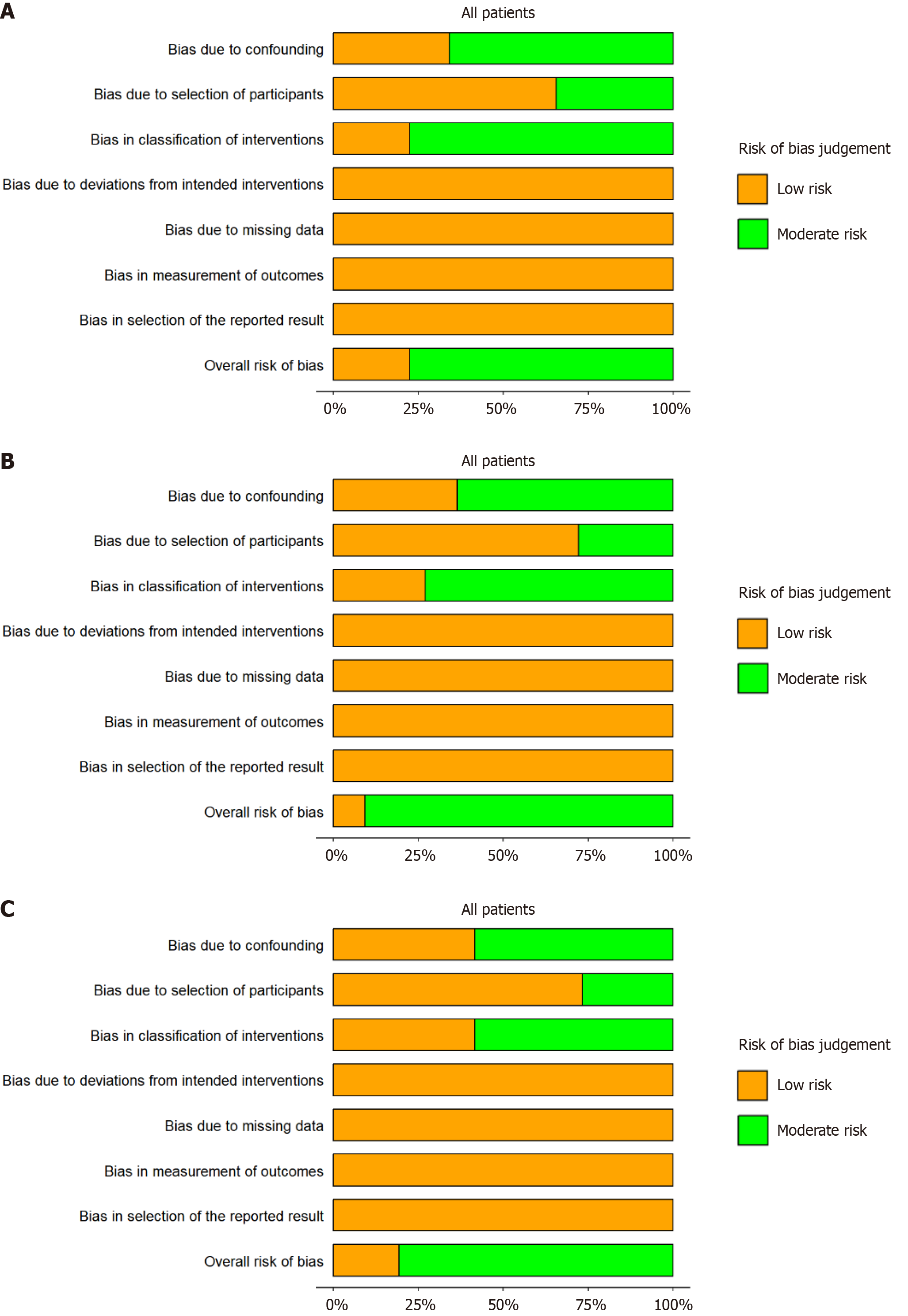 Figure 2 Risk of bias (ROBINS-I) in assessment of major pathological response, pathological complete response, and clinical complete response.