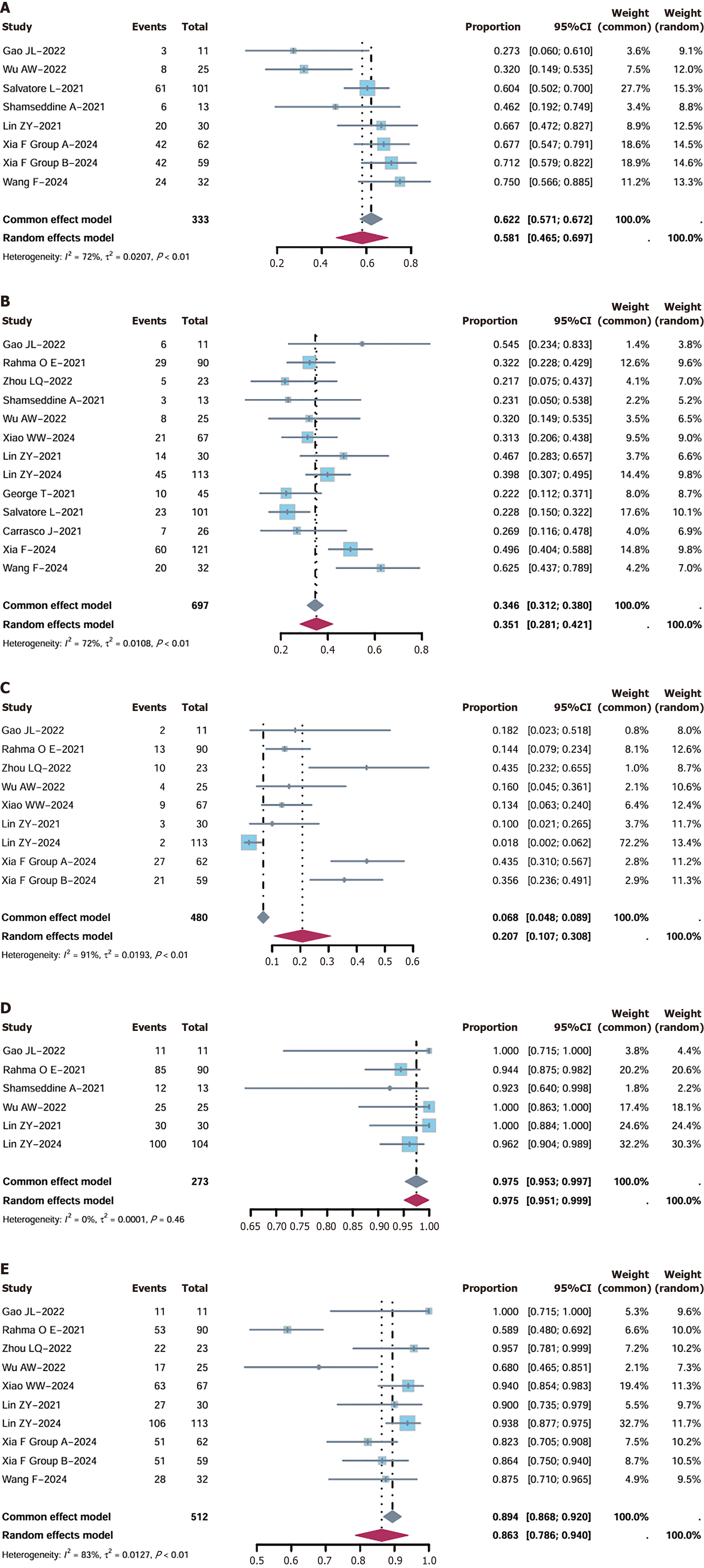 A-C: Forest plot of major pathological response rate risk ratio in the subgroup of patients with proficient mismatch repair (pMMR; A), pathological complete response rate risk ratio in the subgroup of patients with pMMR (B), and clinical complete response rate risk ratio in the subgroup of patients with pMMR (C); D and E: Forest plot of R0 resection (D) and the sphincter preservation (E) rate risk ratio.