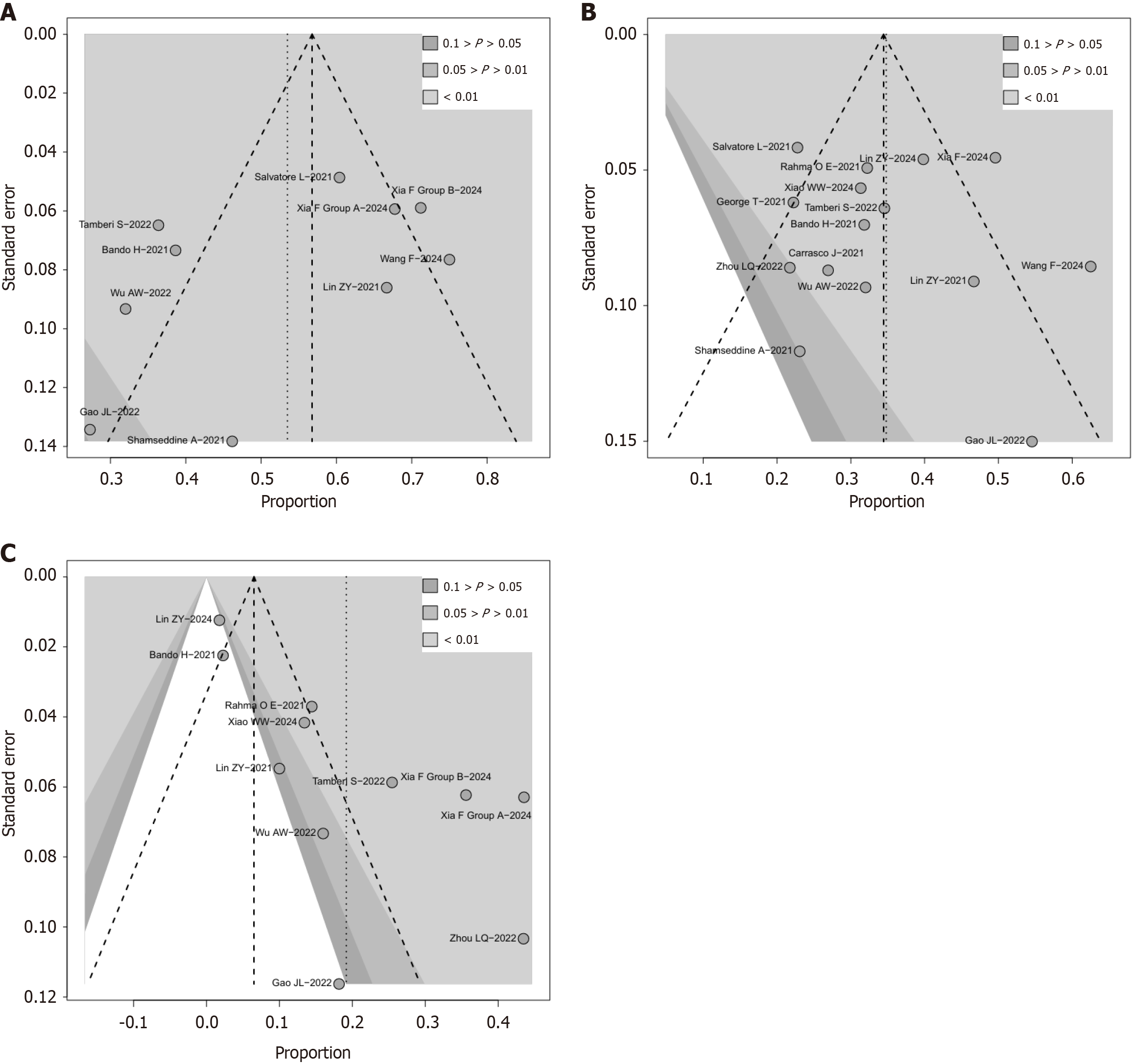 Figure 5 Funnel plot analysis of publication bias for major pathological response, pathological complete response, and clinical complete response.