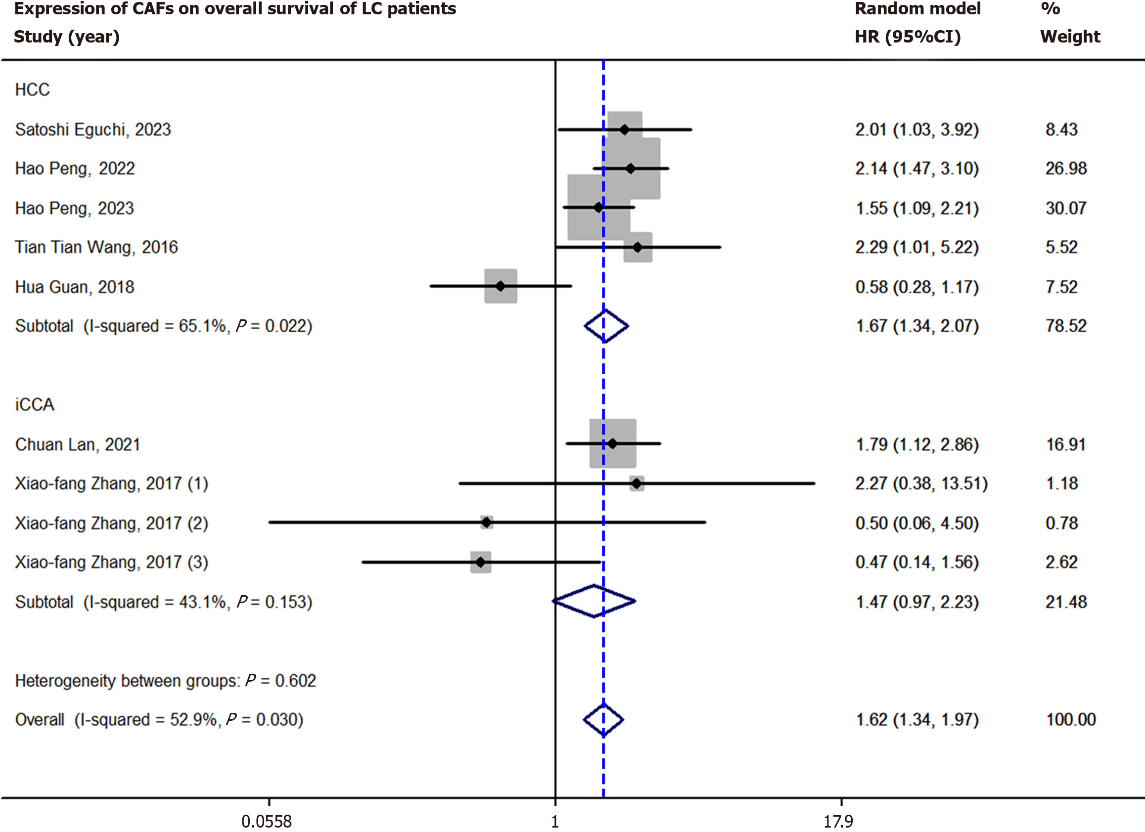 CAF: Cancer-associated fibroblast; HCC: Hepatocellular carcinoma; iCCA: Intrahepatic cholangiocarcinoma; HR: Hazard ratio; CI: Confidence interval.