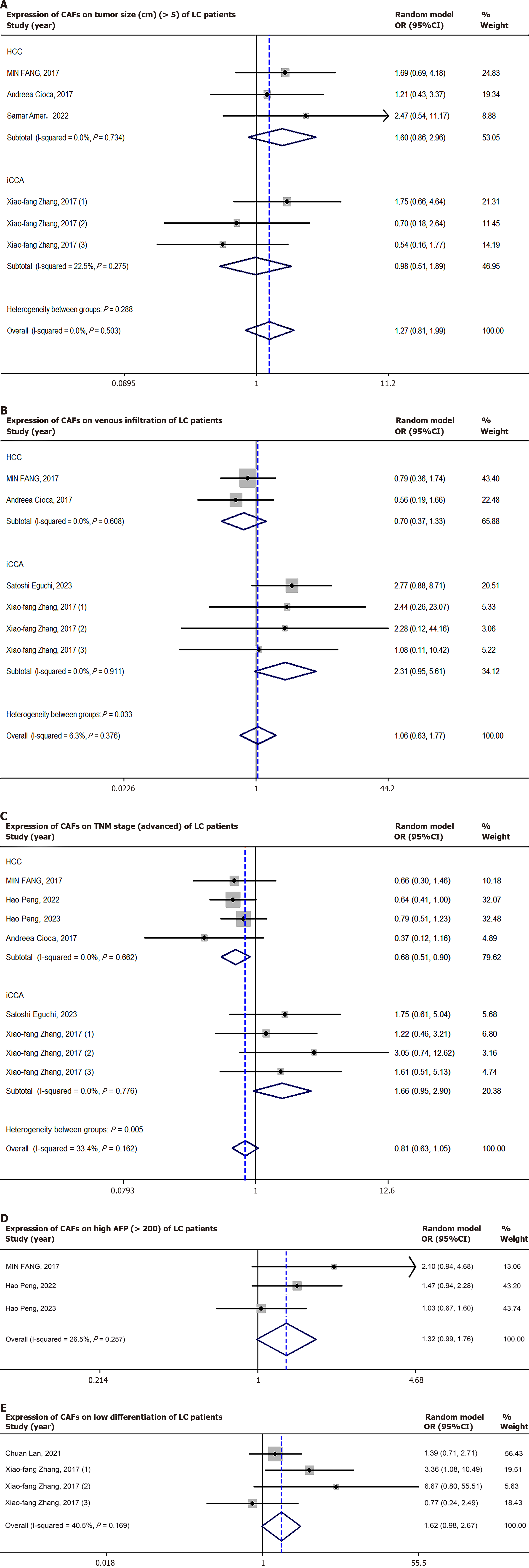 A: Tumor size; B: Venous infiltration; C: Tumor-node-metastasis stage; D: Alpha-fetoprotein level; E: Tumor differentiation. CAF: Cancer-associated fibroblast; LC: Liver cancer; HCC: Hepatocellular carcinoma; iCCA: Intrahepatic cholangiocarcinoma; OR: Odds ratio; CI: Confidence interval.