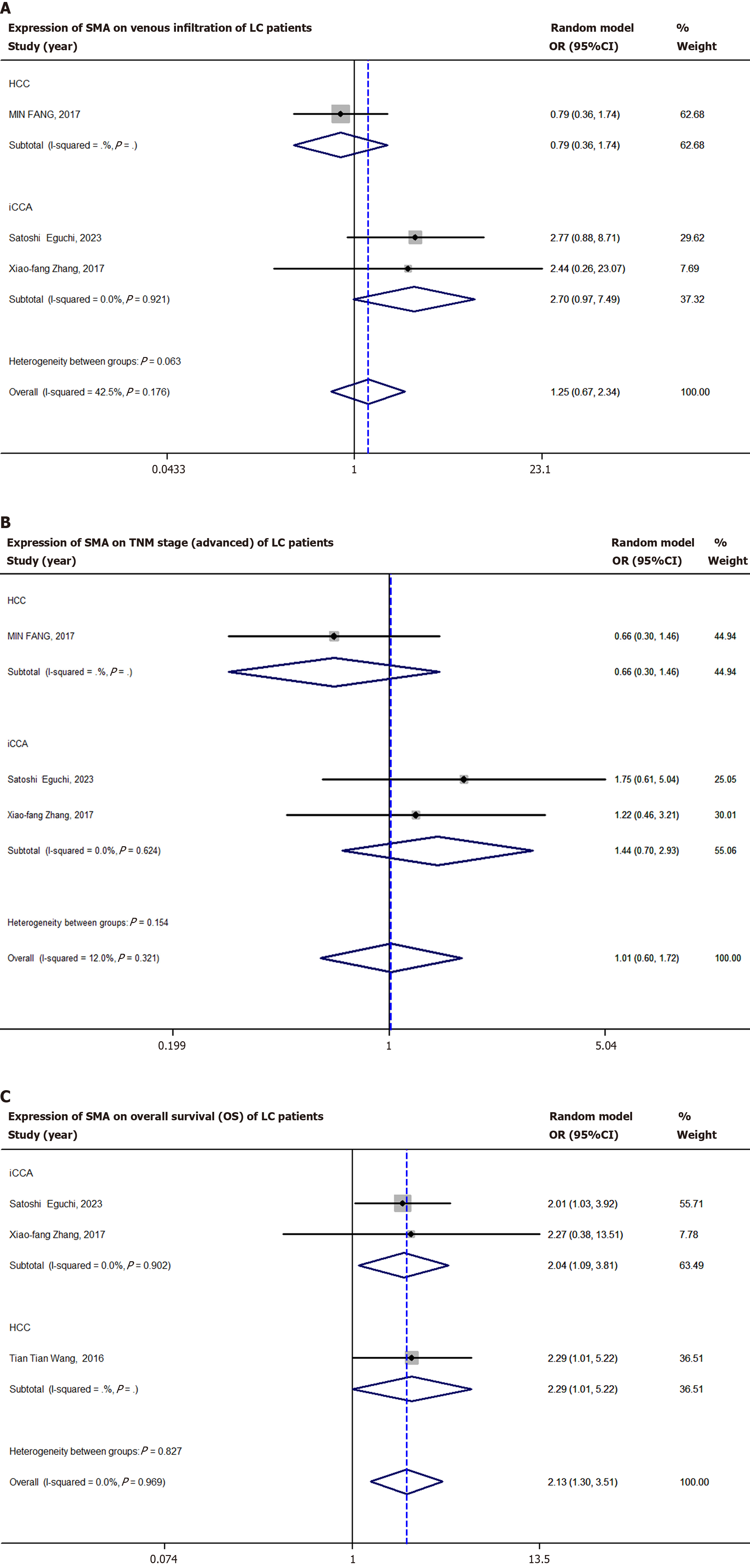 A: Venous infiltration; B: Tumor-node-metastasis stage; C: Overall survival. SMA: Smooth muscle actin; LC: Liver cancer; HCC: Hepatocellular carcinoma; iCCA: Intrahepatic cholangiocarcinoma; OR: Odds ratio; CI: Confidence interval.