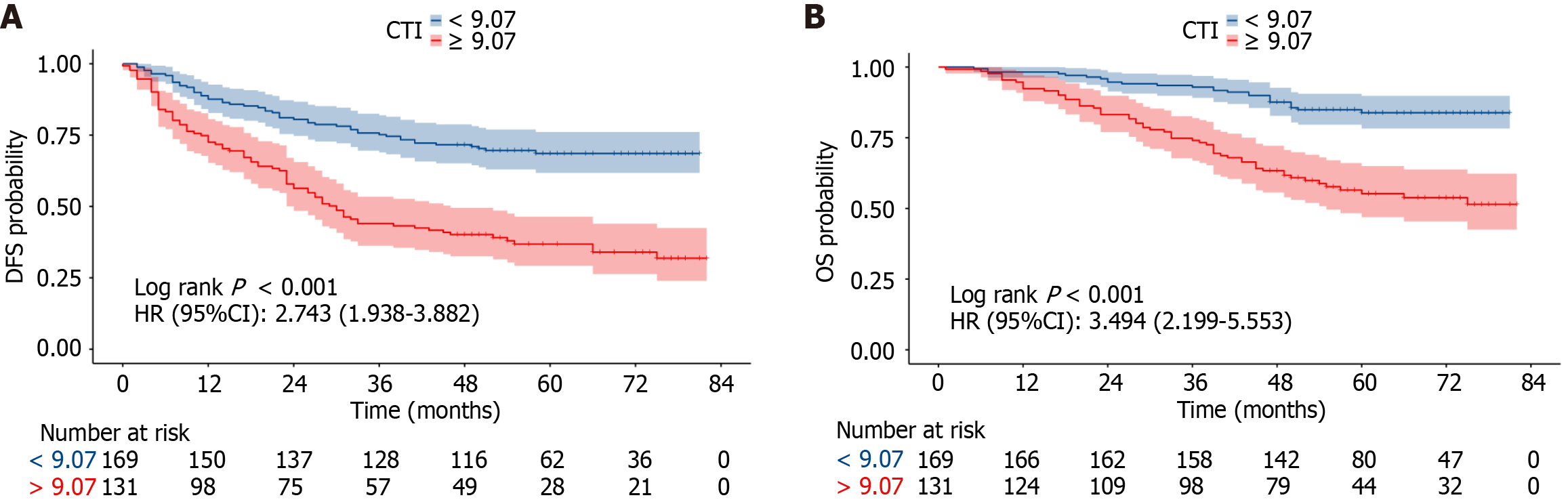 A: Kaplan-Meier plot of disease-free survival in the C-reactive protein-triglyceride-glucose index (CTI) < 9.07 and CTI ≥ 9.07 groups; B: Kaplan-Meier plot of overall survival in the CTI < 9.07 and CTI ≥ 9.07 groups. CTI: C-reactive protein triglyceride-glucose index; HR: Hazard ratio; CI: Confidence interval; DFS: Disease-free survival; OS: Overall survival.