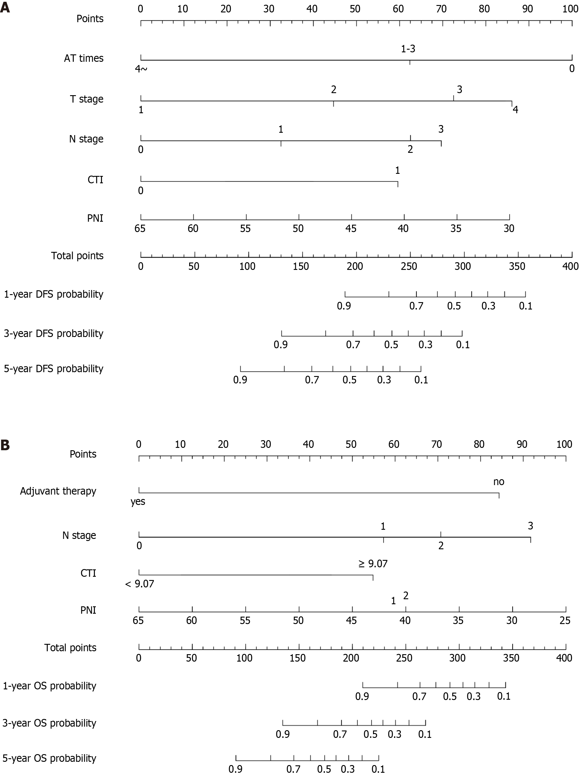 A: Disease-free survival; B: Overall survival. AT: Adjuvant therapy; T: Tumor; N: Node; CTI: C-reactive protein-triglyceride-glucose index; PNI: Prognostic nutritional index; DFS: Disease-free survival; OS: Overall survival.
