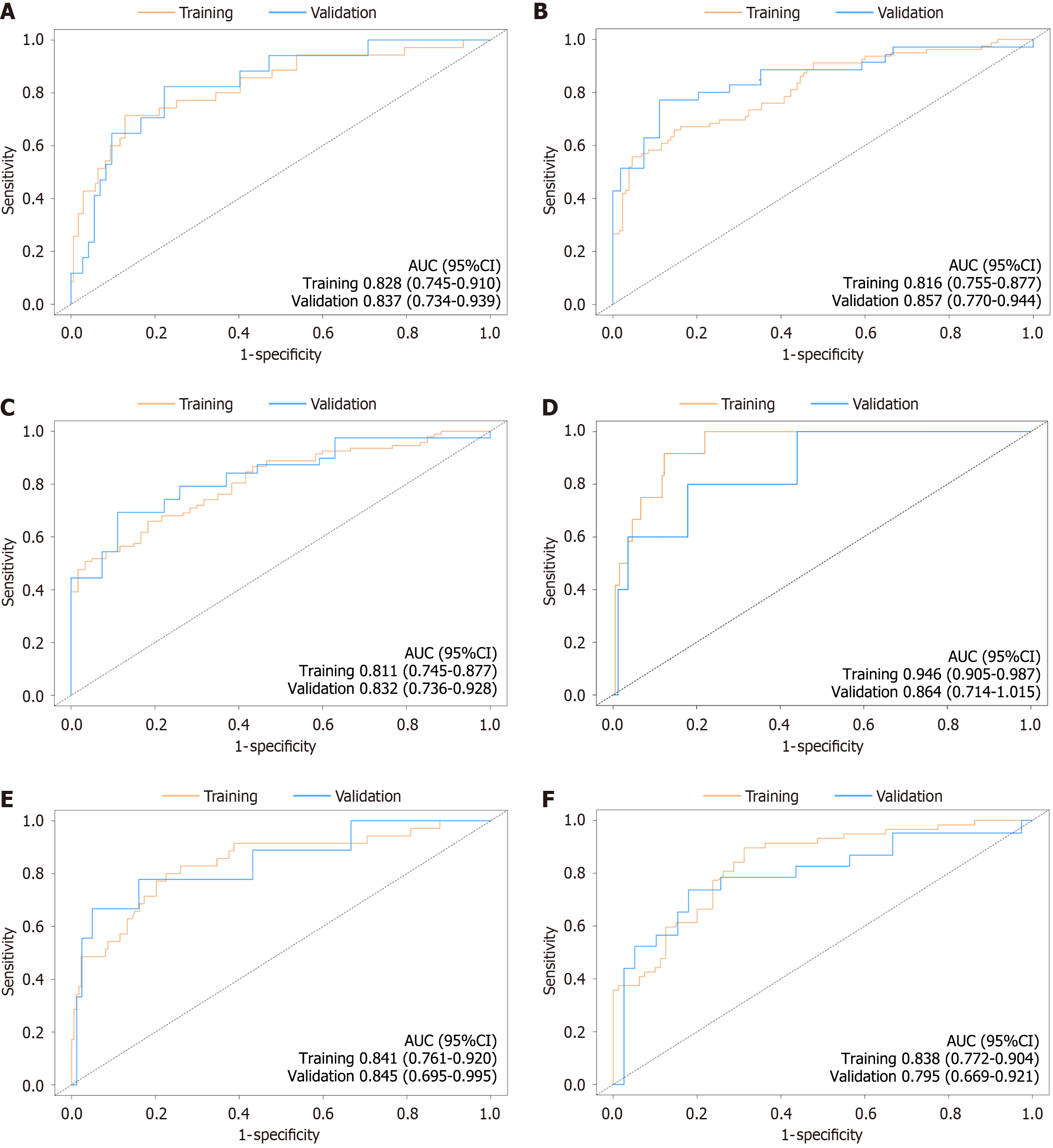 A: Graph showing the training set and validation receiver operating characteristic (ROC) evaluation plots for 1-year disease-free survival (DFS) prognostic prediction model; B: Graph showing the training set and validation set ROC evaluation plots for 3-year DFS prognostic prediction model; C: Graph showing the training set and validation set ROC evaluation plots for 5-year DFS prognostic prediction model; D: Graph showing the training set and validation set ROC evaluation plots for 1-year overall survival (OS) prognostic prediction model; E: Graph showing the training set and validation set ROC evaluation plots for 3-year OS prognostic prediction model; F: Graph showing the training set and validation set ROC evaluation plots for 5-year OS prognostic prediction model. AUC: Area under the curve; CI: Confidence interval.