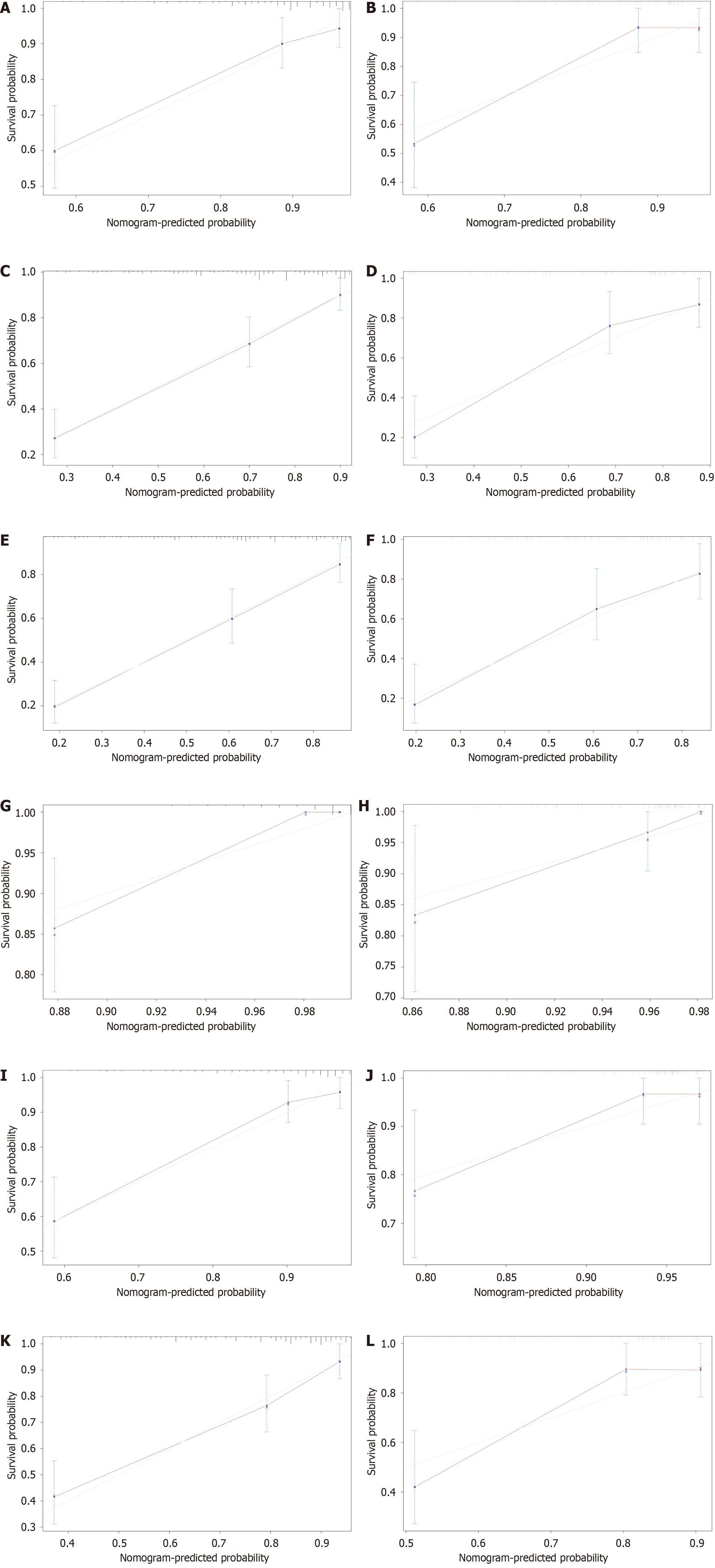 A: Calibration plots for the training set 1-year disease-free survival (DFS); B: Calibration plots for the validation set 1-year DFS; C: Calibration plots for the training set 3-year DFS; D: Calibration plots for the validation set 3-year DFS; E: Calibration plots for the training set 5-year DFS; F: Calibration plots for the validation set 5-year DFS; G: Calibration plots for the training set 1-year overall survival (OS); H: Calibration plots for the validation set 1-year OS; I: Calibration plots for the training set 3-year OS; J: Calibration plots for the validation set 3-year OS; K: Calibration plots for the training set 5-year OS; L: Calibration plots for the validation set 5-year OS.