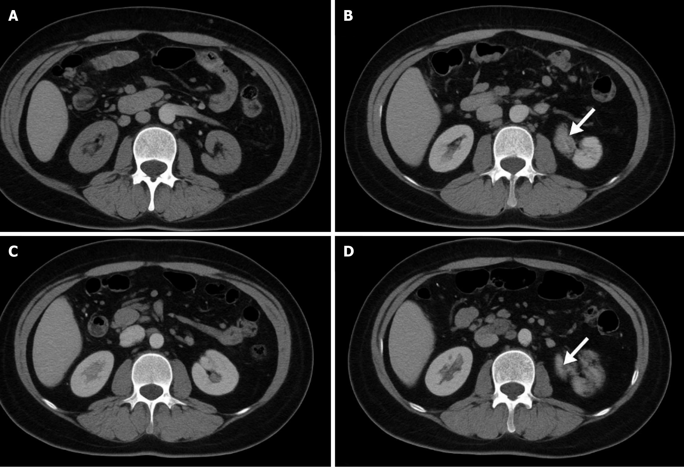 A: Shows the image detection of the operation area of the abdominal obesity group on the 30th postoperative day (POD). The imaging performance of the abdominal operation area of the patient with abdominal obesity on POD 30 showed that the tissue structure in the operation area was clear and there was no abnormal density shadow or effusion. The wound healed well; B: Shows the imaging findings of local recurrence in the abdominal obesity group three months after surgery. Reexamination of the patient with abdominal obesity at 3 months after surgery showed an irregular soft tissue density shadow (arrow) at the edge of the original operation area, and the boundary was fuzzy, indicating local recurrence; C: Shows the image detection of the operation area of the non-abdominal obesity group on the 30th POD. The imaging performance of the patient with non-abdominal obesity in the operation area on POD 30 showed that the anatomical level of the operation area was clear, and no obvious exudation, hematoma, or recurrence was found; D: Shows the imaging detection of local recurrence at 3 months after surgery in the non-abdominal obesity group. The imaging detection figure of the non-abdominal obesity patient three months after operation shows that nodular abnormal signal shadow with a diameter of about 1.2 cm (arrow) appears in the adjacent area of the operation area, and the enhanced scan is uneven and intensive, suggesting local recurrence.