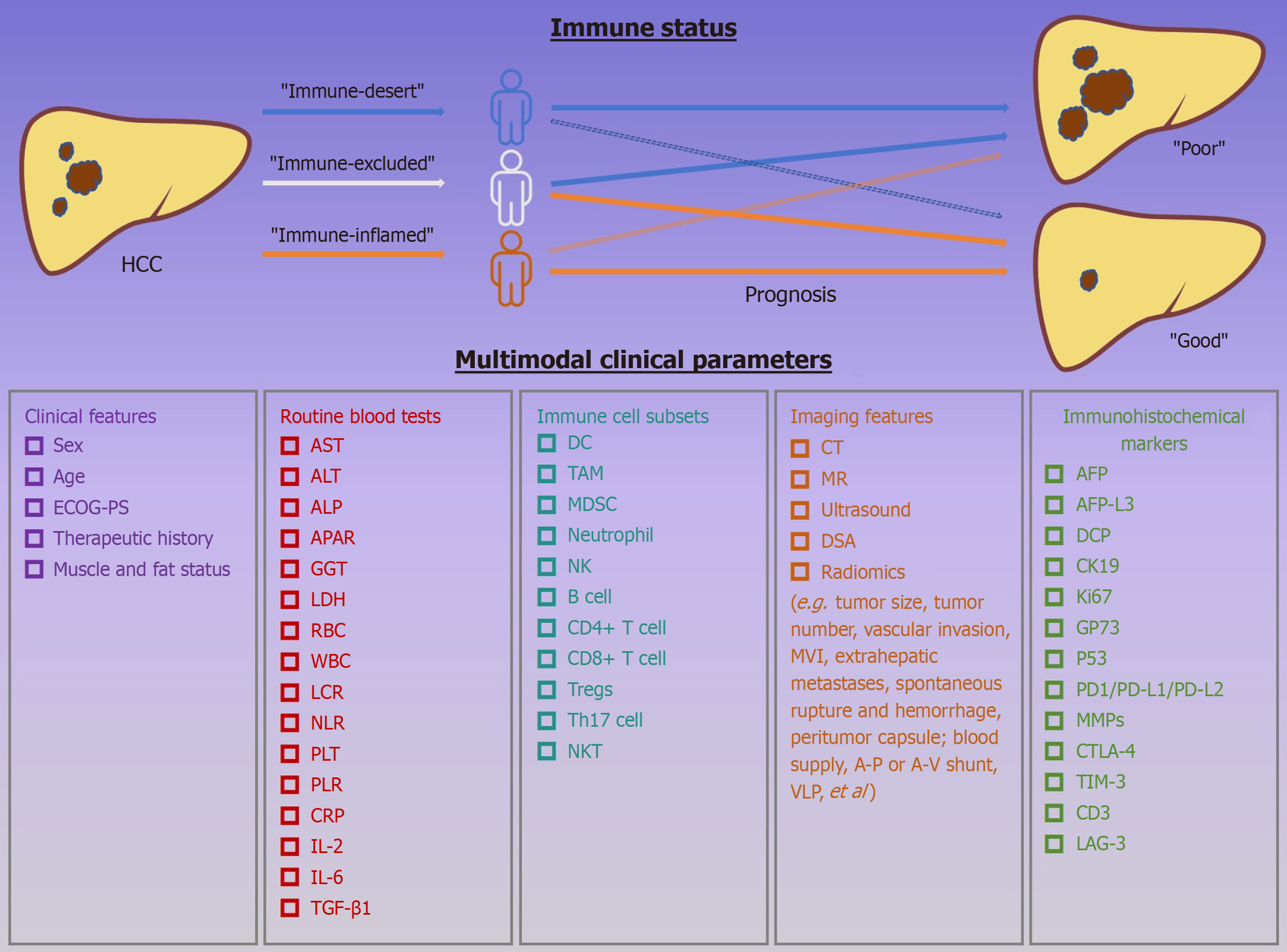 Hepatocellular carcinoma patients present with three distinct immune profiles (“immune-desert”, “immune-excluded”, and “immune-inflamed”), corresponding to divergent prognostic outcomes (poor vs good). Clinical features, routine blood test, immune cell subsets, imaging features and immunochemical markers were used to indicate the different immune status of hepatocellular carcinoma patients, and collected and analyzed their prognostic effects. HCC: Hepatocellular carcinoma; ECOG-PS: Eastern Cooperative Oncology Group-performance status; AST: Aspartate aminotransferase; ALT: Alanine aminotransferase; ALP: Alkaline phosphatase; APAR: Alkaline phosphatase to albumin ratio; GGT: Gamma-glutamyl transferase; LDH: Lactate dehydrogenase; RBC: Red blood cell; WBC: White blood cell; LCR: Lymphocyte-to-C-reactive protein ratio; NLR: Neutrophil-to-lymphocyte ratio; PLT: Platelet; PLR: Platelet-to-lymphocyte ratio; CRP: C-reactive protein; IL: Interleukin; TGF-β: Transforming growth factor-β; DC: Dendritic cell; TAM: Tumor-associated macrophage; MDSC: Myeloid-derived suppressor cell; NK: Natural killer cell; Treg: Regulatory T cell; Th: T helper cell; NKT: Natural killer T cell; CT: Computed tomography; MR: Magnetic resonance; DSA: Digital subtraction angiography; MVI: Microvascular invasion; VLP: Vascular invasion-like pattern; AFP: Alpha-fetoprotein; AFP-L3: Alpha-fetoprotein L3 fraction; DCP: Des-gamma-carboxy prothrombin; CK19: Cytokeratin 19; GP73: Golgi protein 73; PD1: Programmed cell death protein 1; PD-L1: Programmed death-ligand 1; PD-L2: Programmed death-ligand 2; MMPs: Matrix metalloproteinases; CTLA-4: Cytotoxic T-lymphocyte-associated protein 4; TIM-3: T-cell immunoglobulin and mucin-domain containing-3; LAG-3: Lymphocyte-activation gene 3.