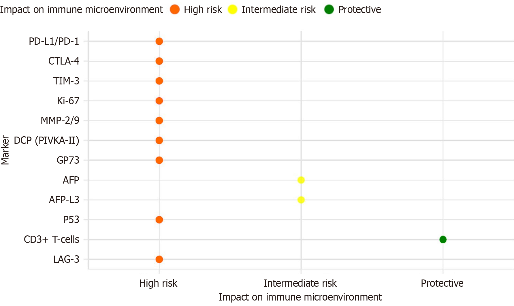 By analyzing the expression patterns of key immune checkpoints and biomarkers in the tumor microenvironment, the prognostic risks of HCC were classified into three categories: High risk, intermediate risk, and protective factors. PD-L1: Programmed death-ligand 1; PD-1: Programmed cell death protein 1; TIM-3: T-cell immunoglobulin and mucin-domain containing-3; MMP: Matrix metalloproteinase; DCP: Des-gamma-carboxy prothrombin; GP73: Golgi protein 73; AFP: Alpha-fetoprotein; AFP-L3: Alpha-fetoprotein L3 fraction; LAG-3: Lymphocyte-activation gene 3.