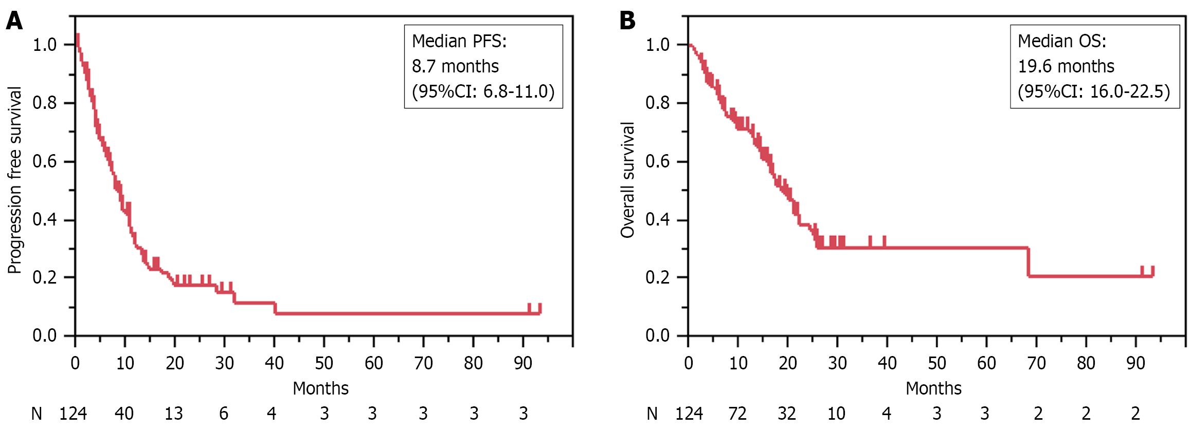 A: Progression-free survival; B: Overall survival. PFS: Progression-free survival; OS: Overall survival.