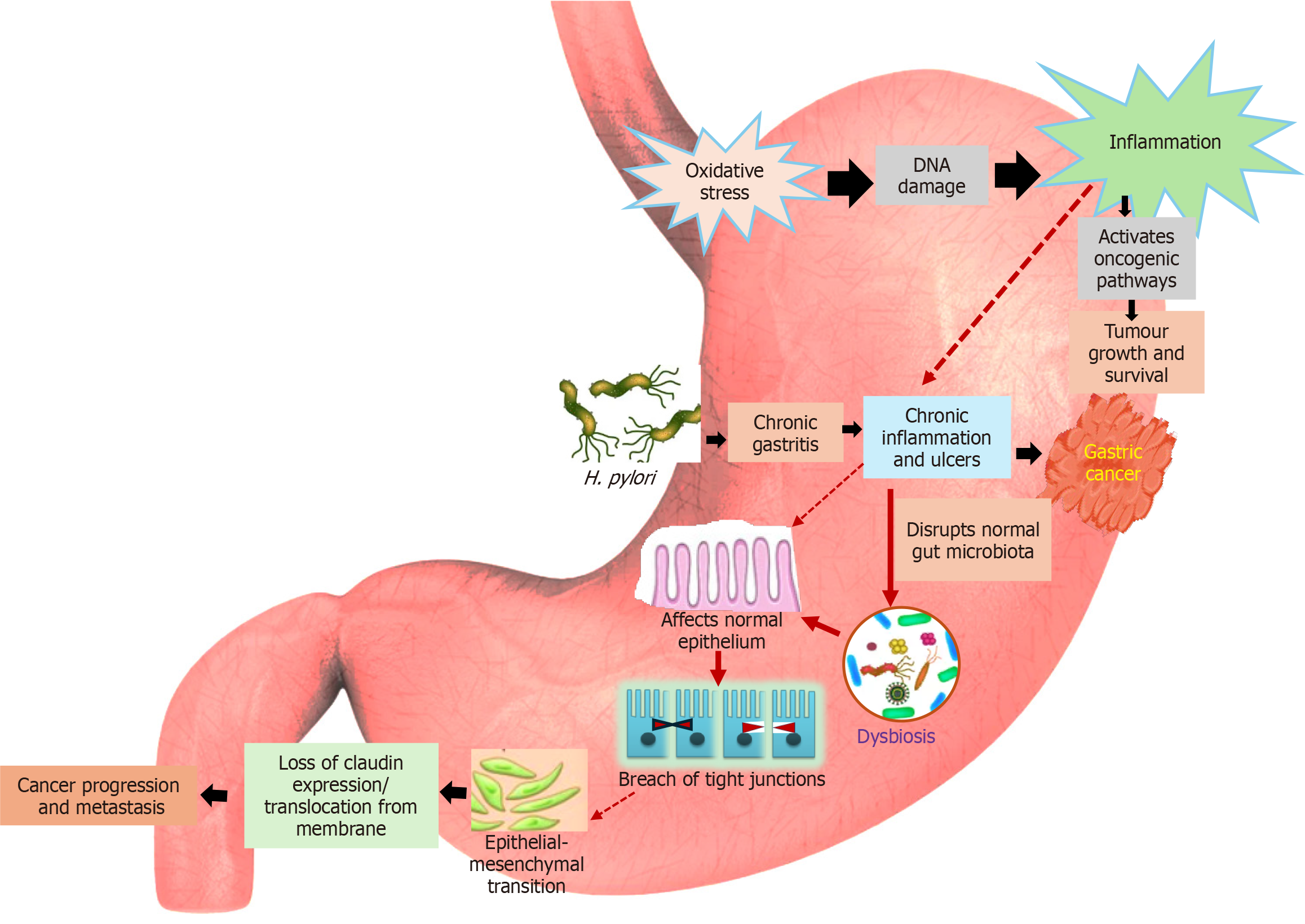 Oxidative stress, free radical induced injury, and Helicobacter pylori infection can trigger chronic inflammation, which in turn causes persistent DNA damage and activates multiple oncogenic pathways that drive carcinogenesis. Moreover, chronic inflammation and ulcer formation can disrupt the balance of gut microbiota, leading to dysbiosis and increased intestinal permeability (‘leaky gut’). This dysregulated microenvironment further promotes epithelial mesenchymal transition, thereby facilitating gastric cancer progression and metastasis. H. pylori: Helicobacter pylori.