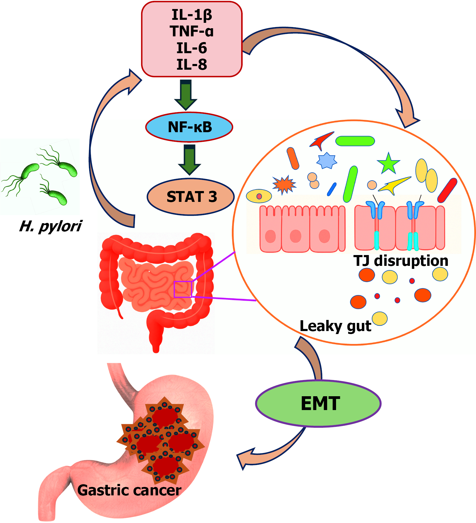 Helicobacter pylori infection triggers gastric inflammation by activating cytokine, nuclear factor kappa B, and signal transducer and activator of transcription 3 mediated inflammatory cascades, leading to tight junction disruption and increased intestinal permeability. The resulting leaky gut permits translocation of microbial toxins and inflammatory mediators, which promote epithelial mesenchymal transition and drive gastric carcinogenesis. IL: Interleukin; TNF: Tumor necrosis factor; NF-κB: Nuclear factor kappa B; STAT3: Signal transducer and activator of transcription 3; H. pylori: Helicobacter pylori; TJ: Tight junction; EMT: Epithelial me senchymal transition.