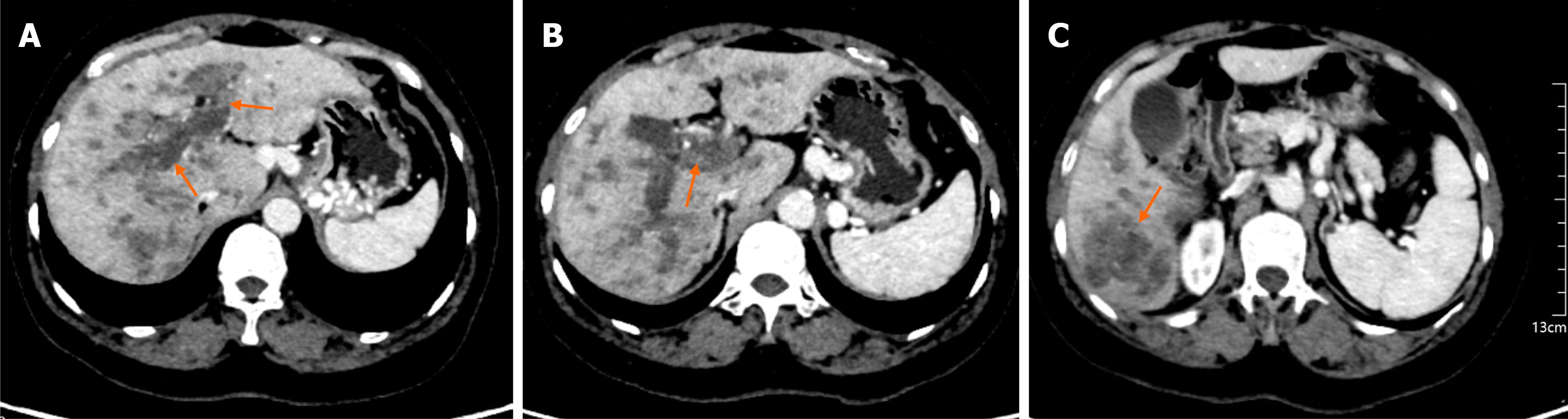 A: Thrombus in the left and right branches of the portal vein; B: Thrombus within the main portal vein; C: A mass of approximately 5.1 cm × 5.0 cm in the right lobe of the liver.