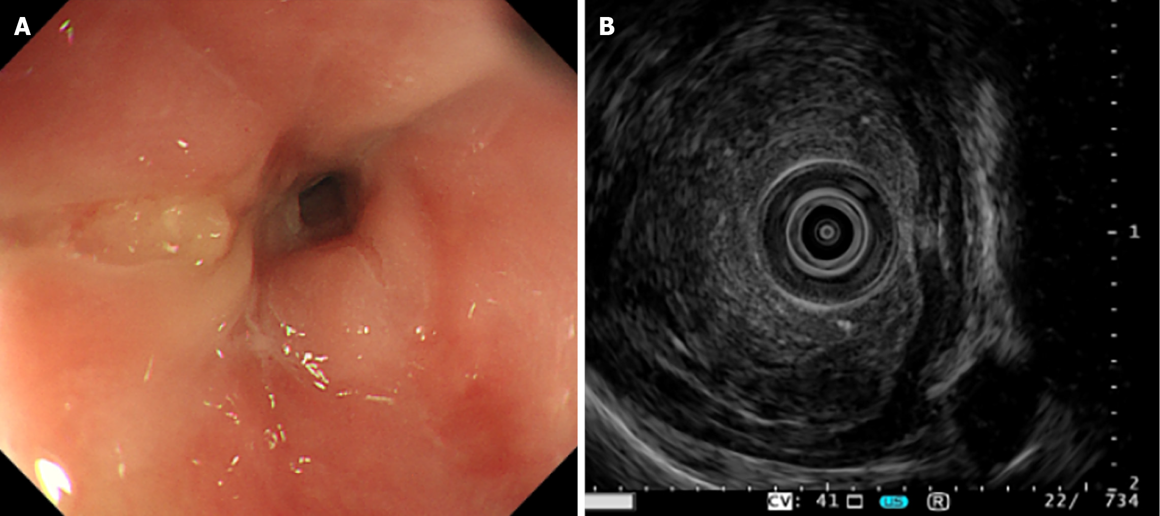 A: White-light endoscopy showing significant mucosal stenosis at 30 cm from incisors, with a soft and friable lesion; B: Endoscopic ultrasound demonstrating loss of normal mural layer structure and serosal interruption at lesion site (max wall thickness: 1.11 cm).