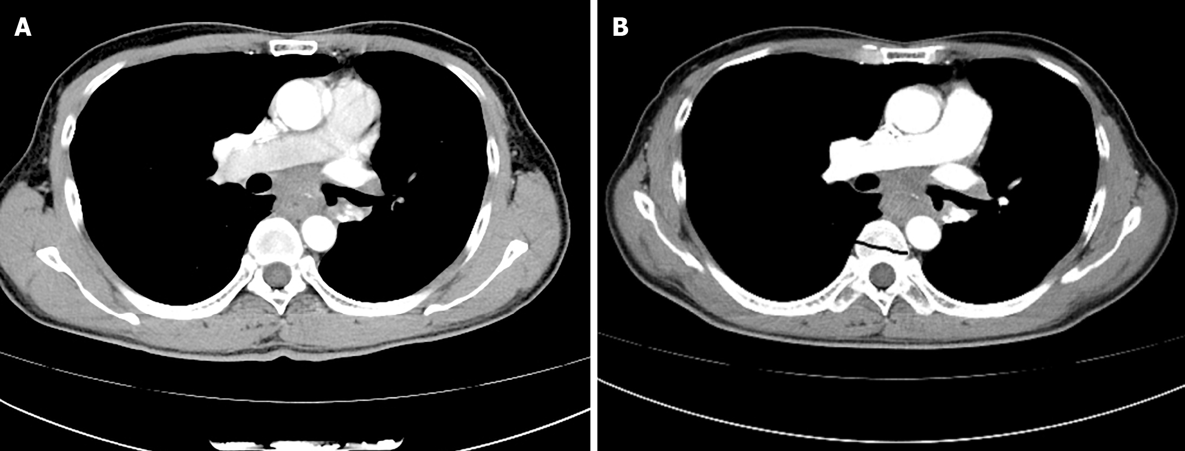 A: Showing mid-esophageal wall thickening and subcarinal lymphadenopathy when the patient presented to the thoracic surgeon; B: Showing the volume of the esophageal tumor increased, causing the esophageal lumen to narrow, after two cycles of neoadjuvant immunochemotherapy.