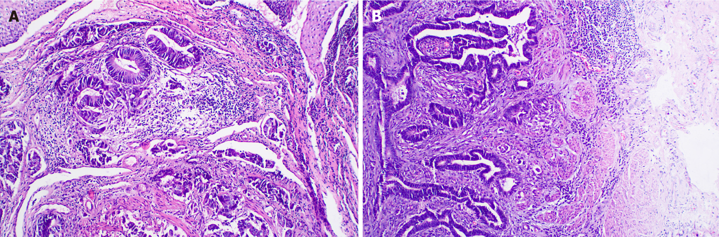 A: Esophageal tumor; B: Primary rectal adenocarcinoma.