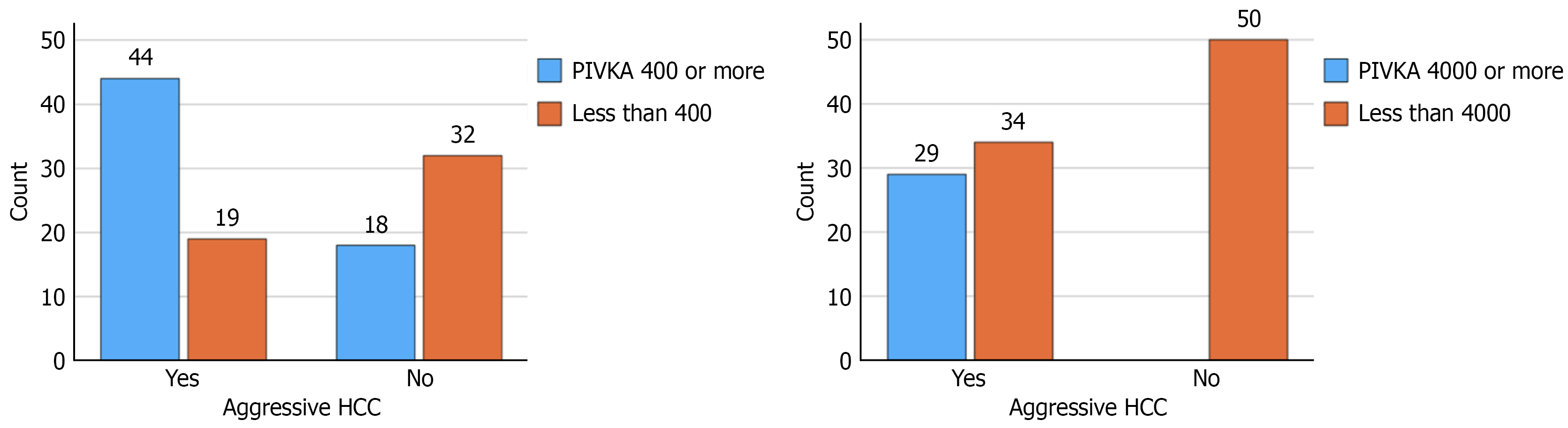 All tumors with protein induced by vitamin K absence/antagonist-II > 4000 mAU/mL were aggressive, whereas at > 400 mAU/mL the cohort splits between aggressive and non-aggressive tumors, as shown. PIVKA: Protein induced by vitamin K absence; HCC: Hepatocellular carcinoma.