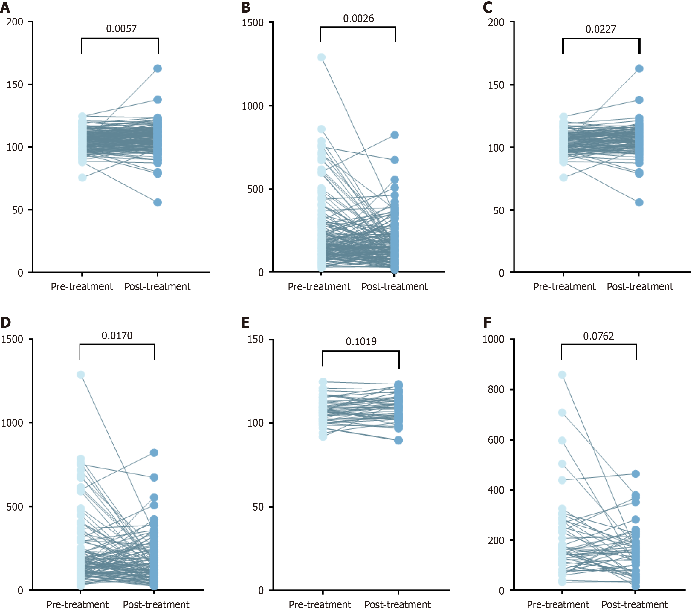A and B: The changes in geriatric nutritional risk index (GNRI) and pan-immune-inflammation value (PIV) during neoadjuvant chemotherapy; C and D: The influence of nutritional intervention on GNRI and PIV; E and F: The influence of no nutritional supplementation on GNRI and PIV.