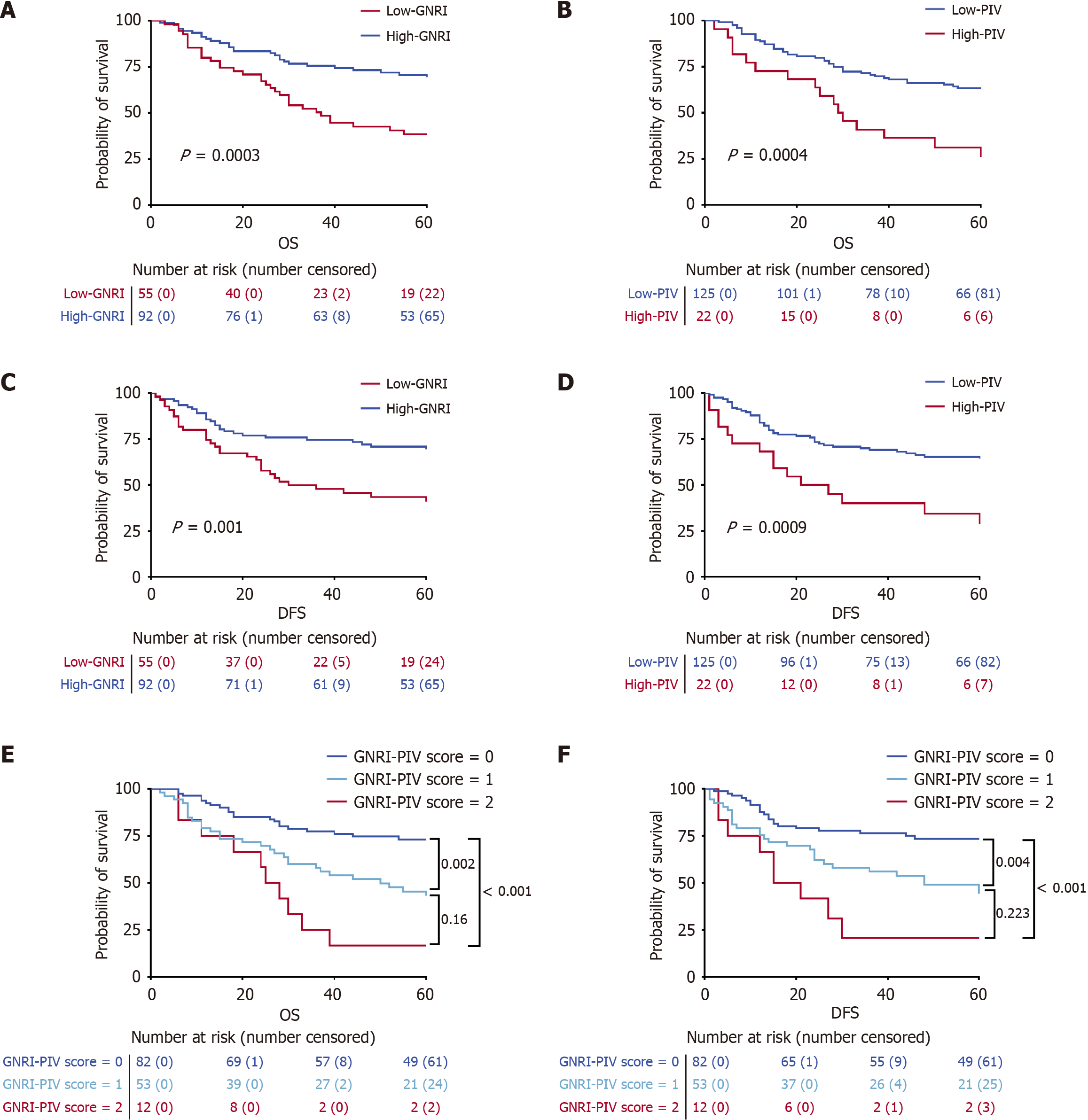 A and B: Kaplan-Meier plot lines of overall survival for different geriatric nutritional risk index (GNRI) and pan-immune-inflammation value (PIV) groups; C and D: Disease-free survival for different GNRI and PIV groups; E and F: Overall survival and disease-free survival for different GNRI-PIV score groups. OS: Overall survival; GNRI: Geriatric nutritional risk index; PIV: Pan-immune-inflammation value; DFS: Disease-free survival.
