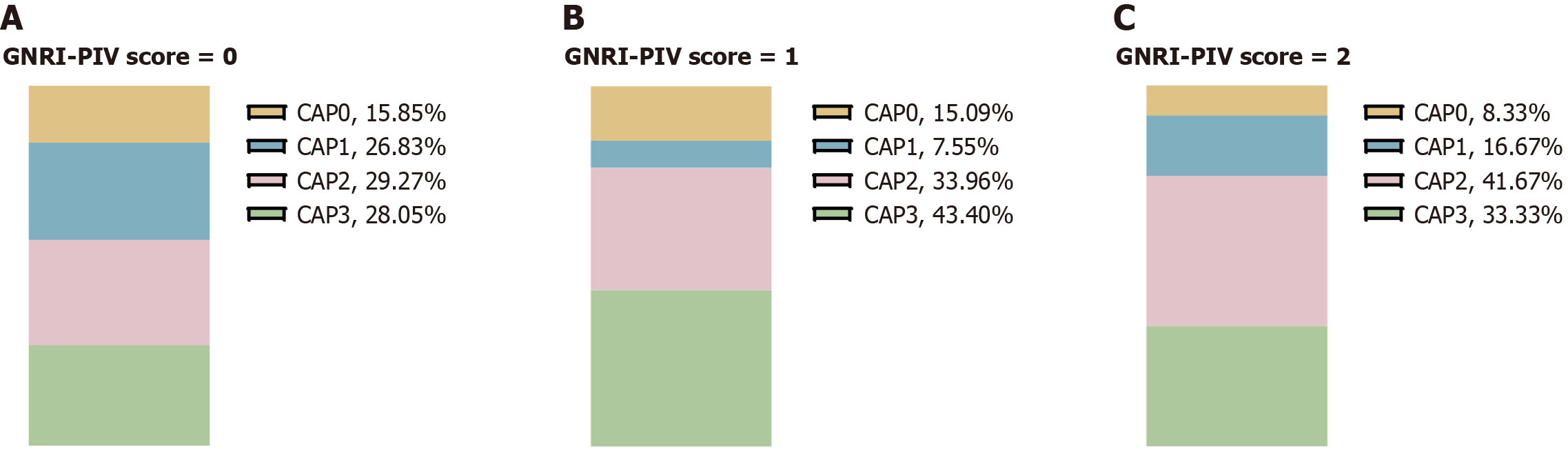 A: Distribution of College of American Pathologists (CAP) grading in patients with a geriatric nutritional risk index (GNRI)-pan-immune-inflammation value (PIV) score of 0; B: CAP grading in patients with a GNRI-PIV score of 1; C: CAP grading in patients with a GNRI-PIV score of 2. GNRI: Geriatric nutritional risk index; PIV: Pan-immune-inflammation value; CAP: College of American Pathologists.