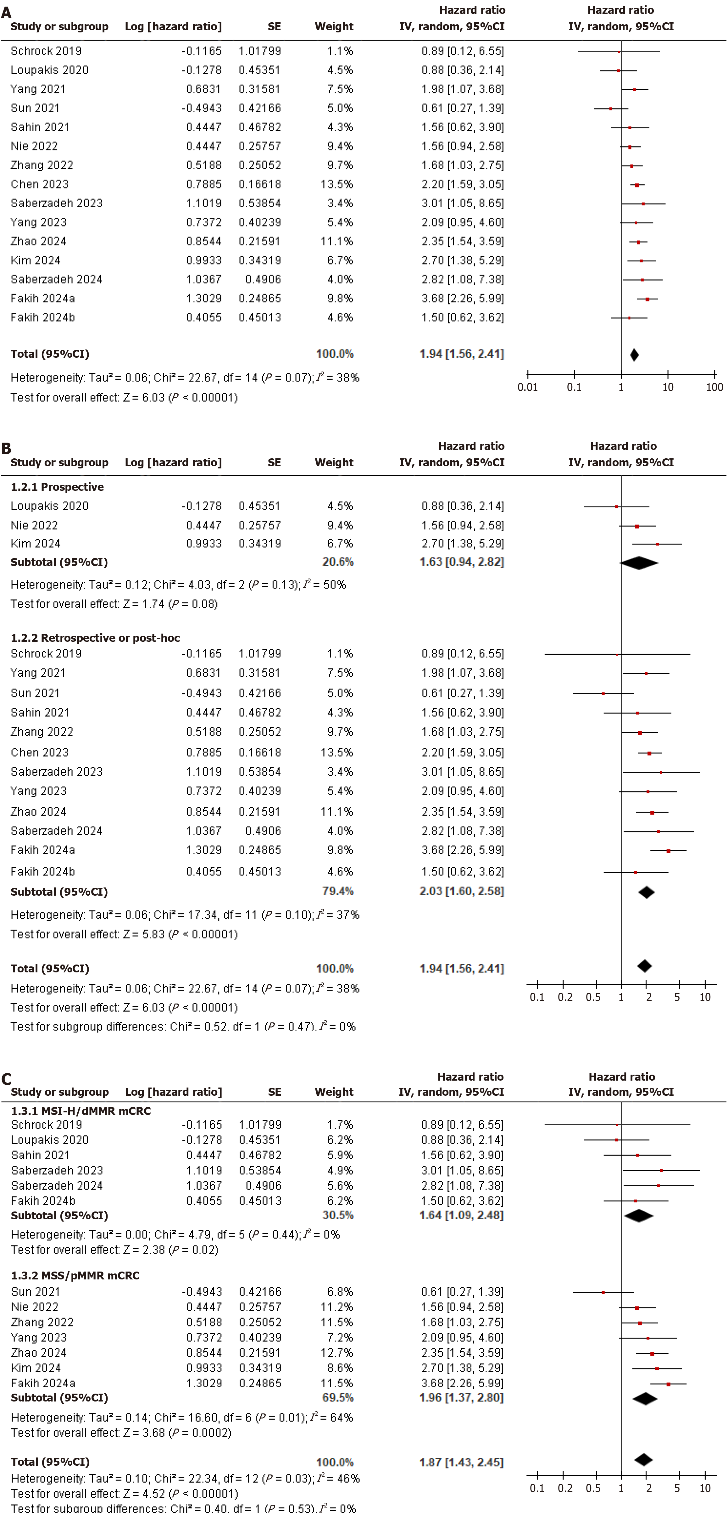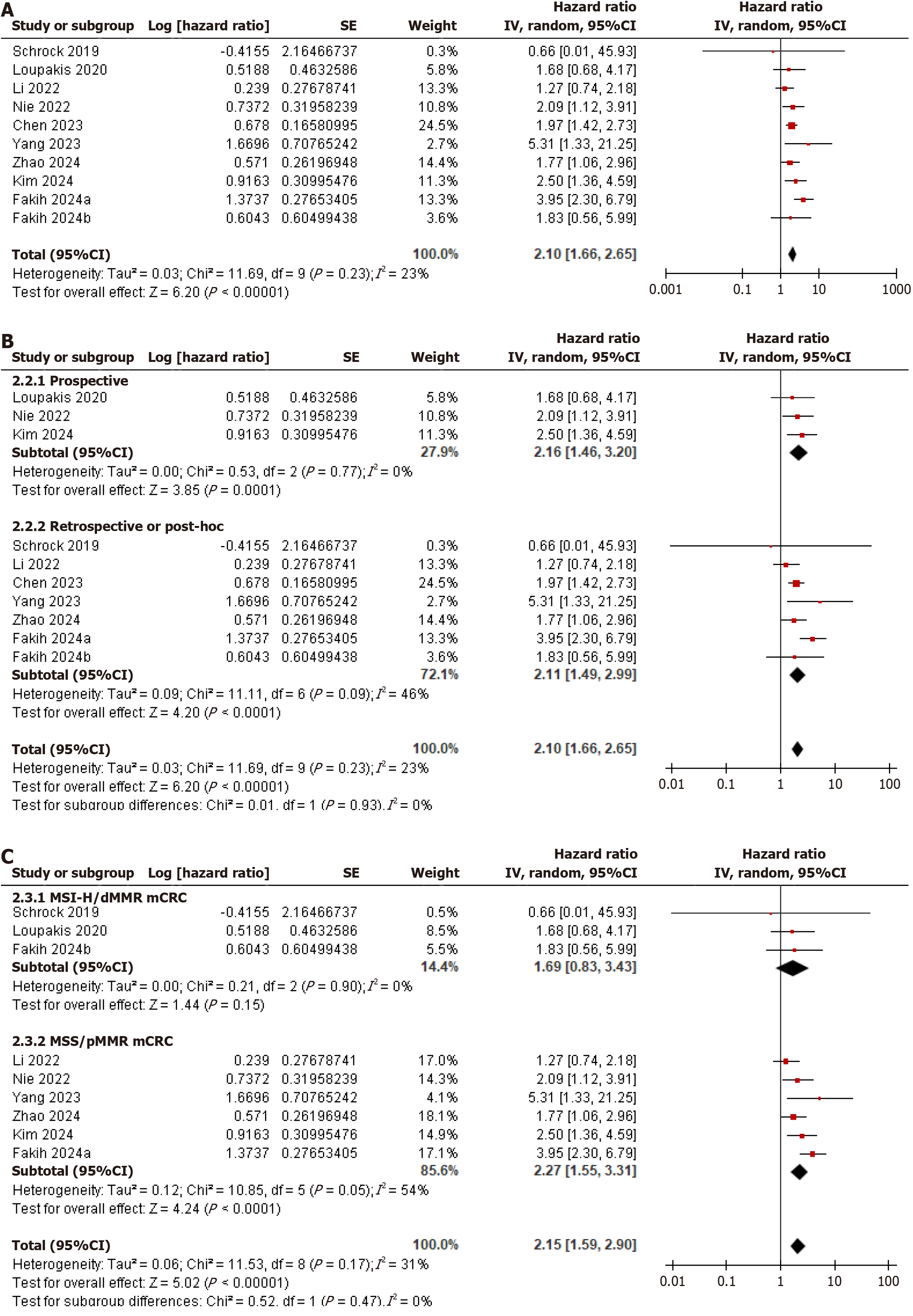 A: Overall meta-analysis; B: Subgroup analysis according to study design; C: Subgroup analysis according to the type of metastatic colorectal cancer. 95%CI: 95% confidence interval.