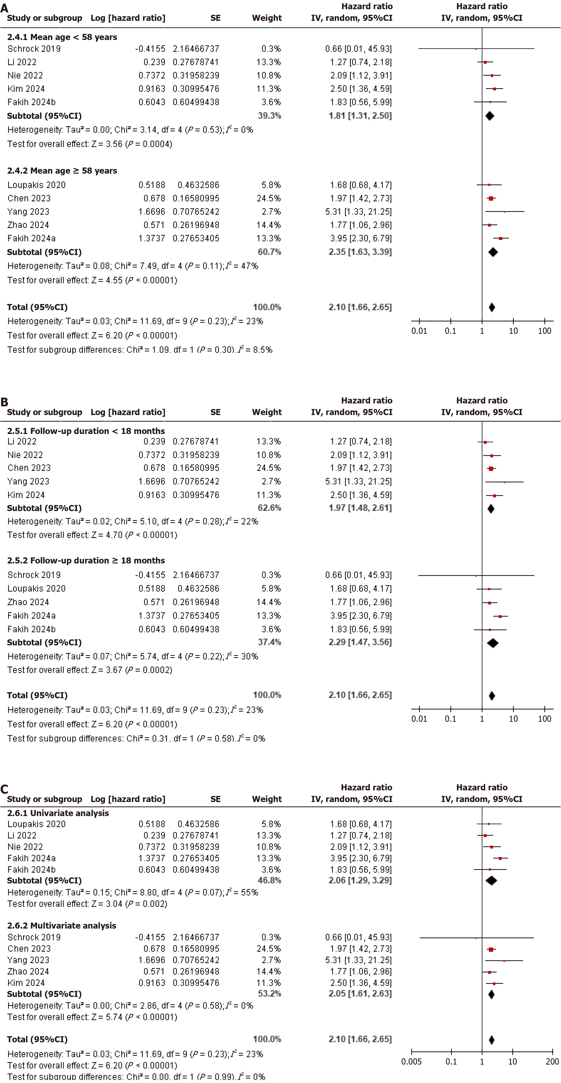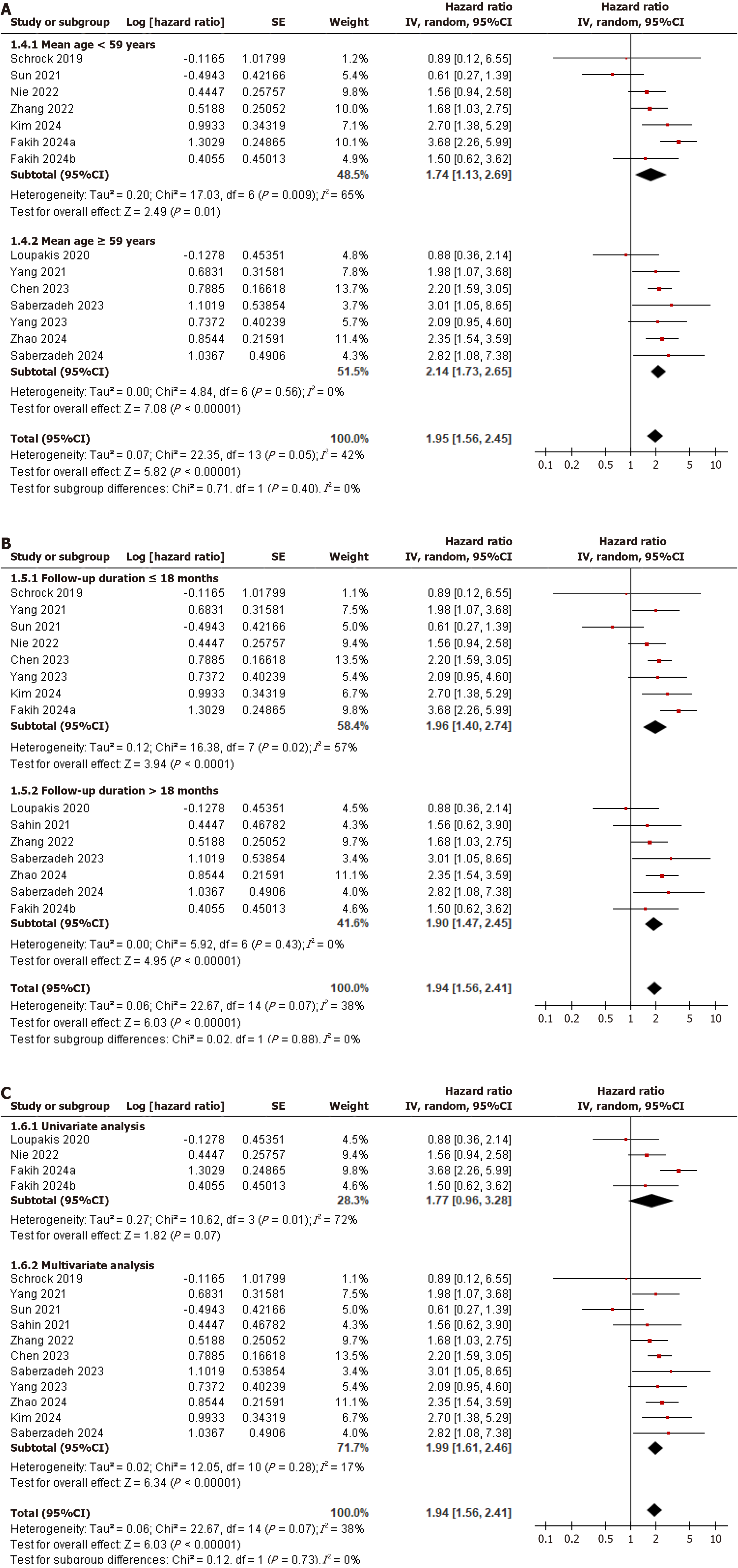 A: Subgroup analysis according to mean age of the patients; B: Subgroup analysis according to follow-up duration; C: Subgroup analysis according to analytic model. 95%CI: 95% confidence interval.