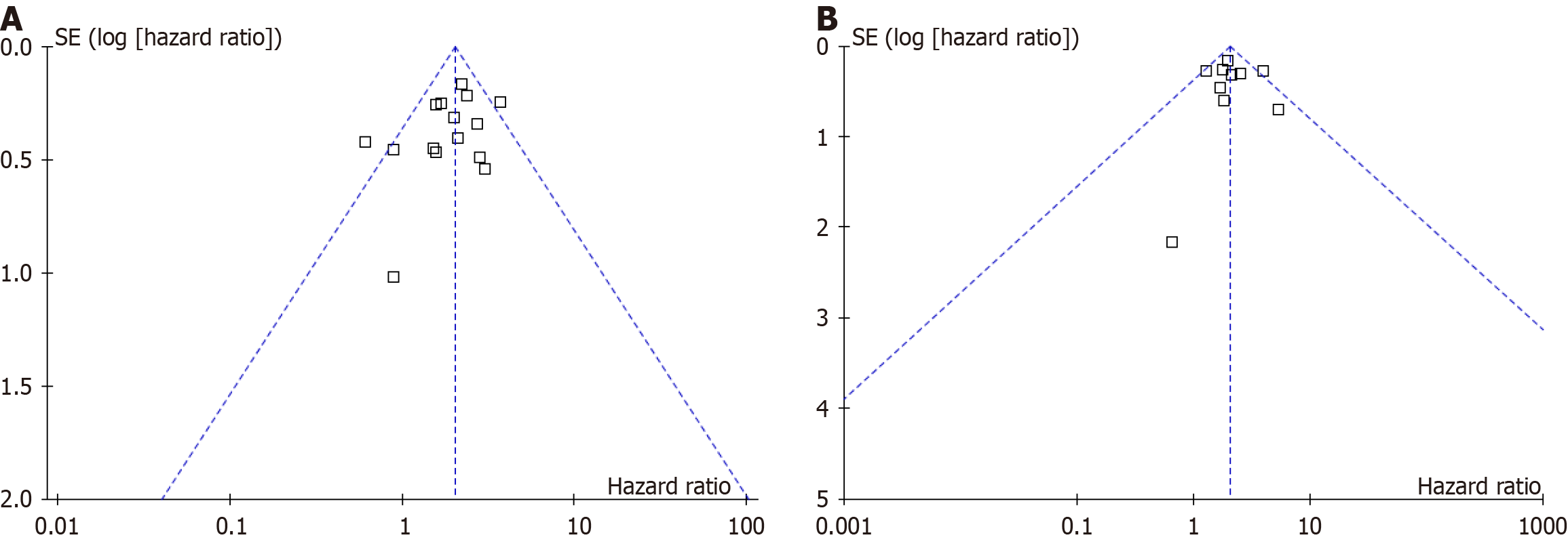 A: Funnel plots for the meta-analysis of the association between liver metastasis and progression-free survival in patients with metastatic colorectal cancer (mCRC) treated with immune checkpoint inhibitors (ICIs); B: Bunnel plots for the meta-analysis of the association between liver metastasis and overall survival in patients with mCRC treated with ICIs.