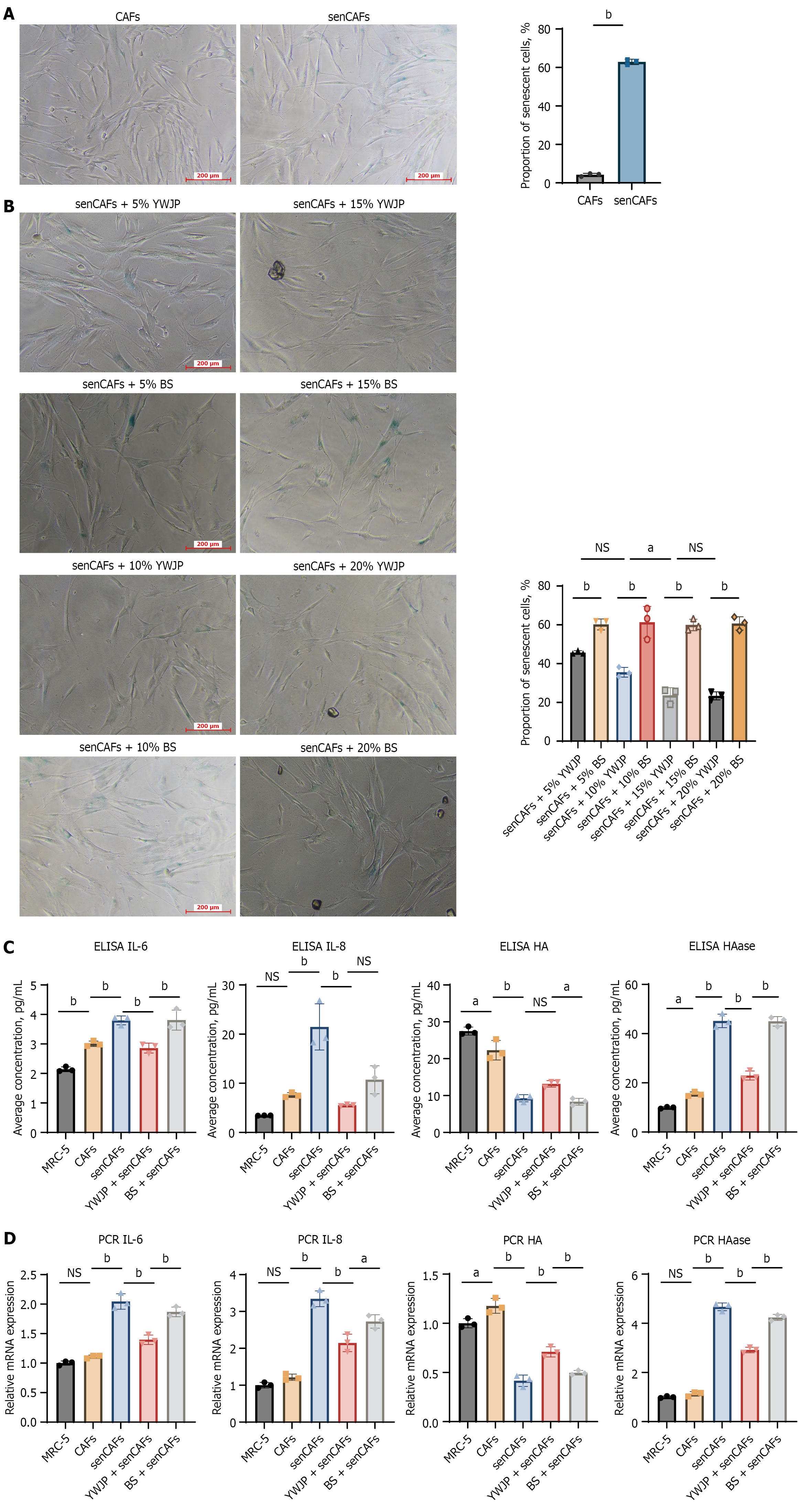 A: Proportion of β-galactosidase staining-positive cells in the cancer-associated fibroblasts (CAFs) model and senescent CAFs (senCAFs) model under the same scale bar; B: Reversal effect on senCAFs by Yiqi Wenyang Jiedu prescription (YWJP)-containing serum at different concentrations vs blank serum (BS); C: Secretion levels of interleukin-6 (IL-6), interleukin-8 (IL-8), hyaluronic acid (HA), and HAase in senCAFs treated with YWJP at different concentrations vs BS, detected by ELISA; D: MRNA expression levels of IL-6, IL-8, HA, and HAase in senCAFs treated with YWJP at different concentrations vs BS, detected by quantitative PCR. aP < 0.05, bP < 0.01, NS: Not significant. Error bars represent the standard error of the data. CAF: Cancer-associated fibroblasts; YWJP: Yiqi Wenyang Jiedu prescription; BS: Blank serum; senCAFs: Senescent cancer-associated fibroblasts; IL-6: Interleukin-6; IL-8: Interleukin-8; HA: Hyaluronic acid.