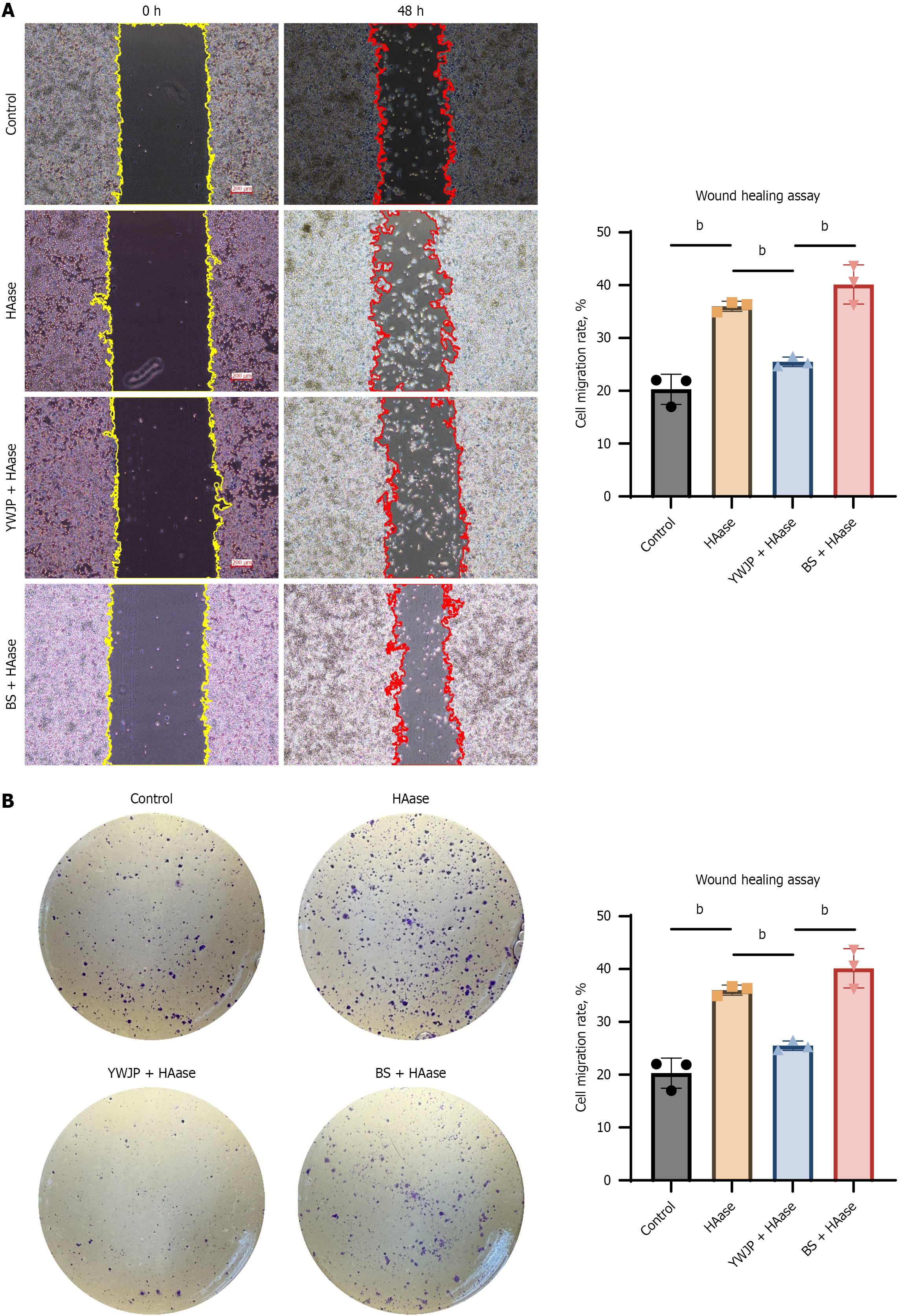 A: Effect of Yiqi Wenyang Jiedu prescription (YWJP) on migration of MKN45 cells in HAase environment; B: Effect of YWJP on colony-forming ability of MKN45 cells in HAase environment. bP < 0.01. Error bars represent the standard error of the data. YWJP: Yiqi Wenyang Jiedu prescription; BS: Blank serum.