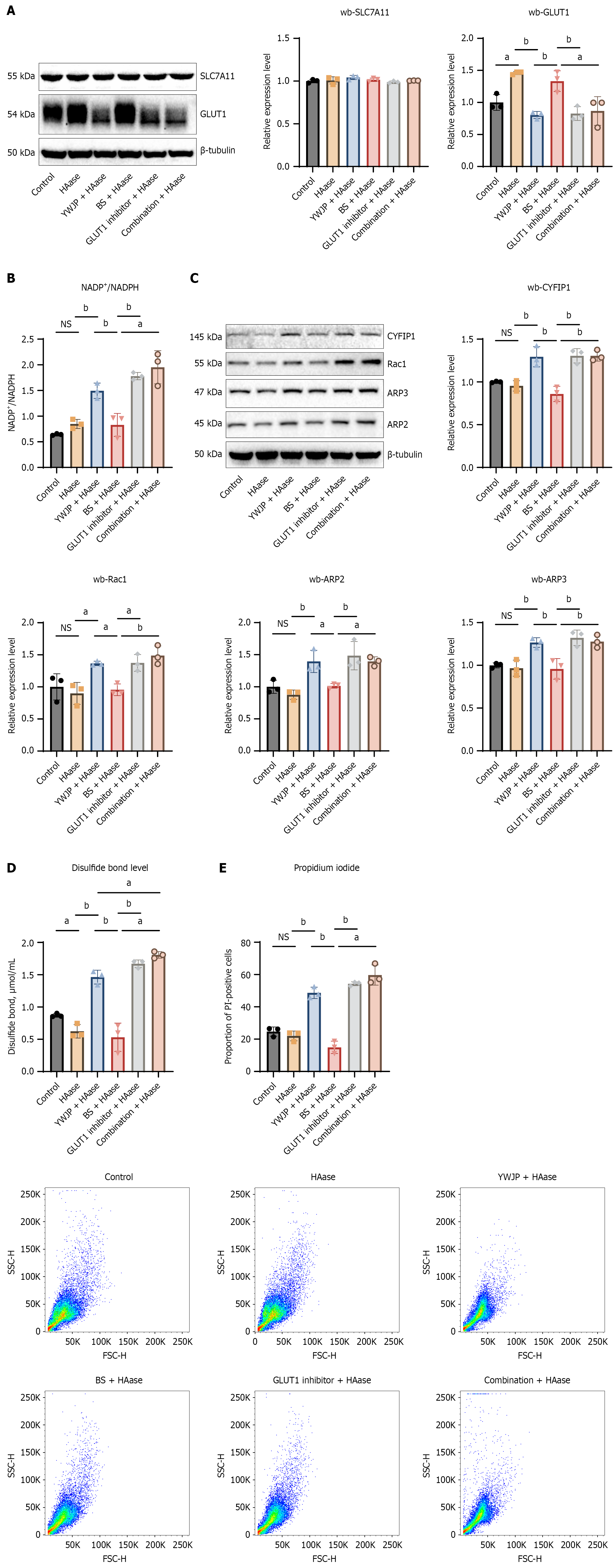A: Effect of Yiqi Wenyang Jiedu prescription (YWJP) on the expression of SLC7A11 and GLUT1 in MKN45 cells in HAase environment; B: Effect of YWJP on the NADP+/NADPH ratio in MKN45 cells in HAase environment; C: Effect of YWJP on the expression of CYFIP1, Rac1, ARP2, and ARP3 in MKN45 cells in HAase environment; D: Effect of YWJP on the disulfide bond level in MKN45 cells in HAase environment; E: Effect of YWJP on PI staining of MKN45 cells. aP < 0.05, bP < 0.01, NS: Not significant. Error bars represent the standard error of the data. CAF: Cancer-associated fibroblasts; YWJP: Yiqi Wenyang Jiedu prescription; BS: Blank serum.