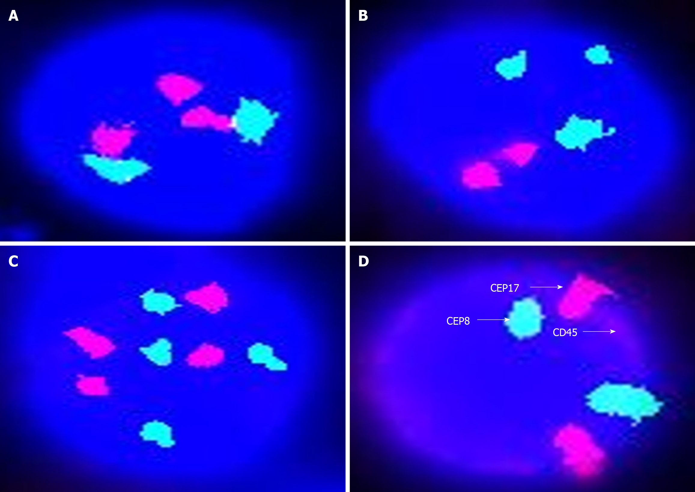A: CD45(-), CEP8 > 2, circulating tumor cells (CTCs) positive; B: CD45(-), CEP17 > 2, CTCs positive; C: CD45(-), CEP8 > 2, CEP17 > 2, CTCs positive; D: CD45(+), CEP8 = 2, CEP17 = 2, CTCs negative.