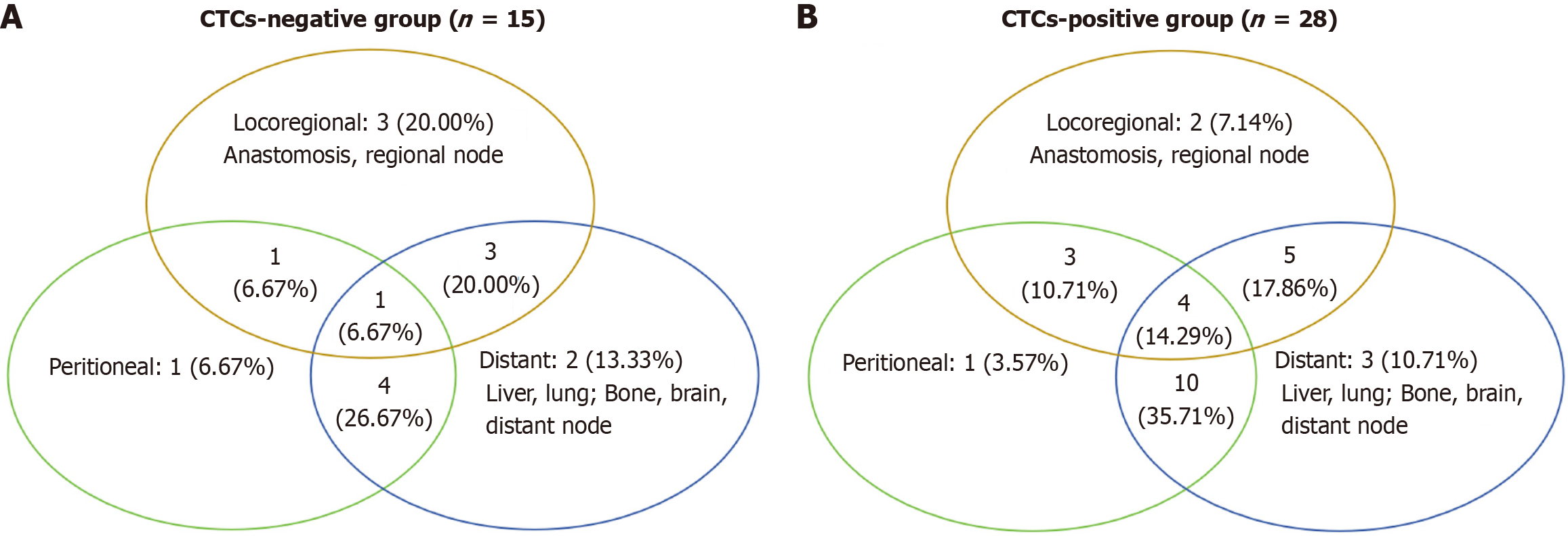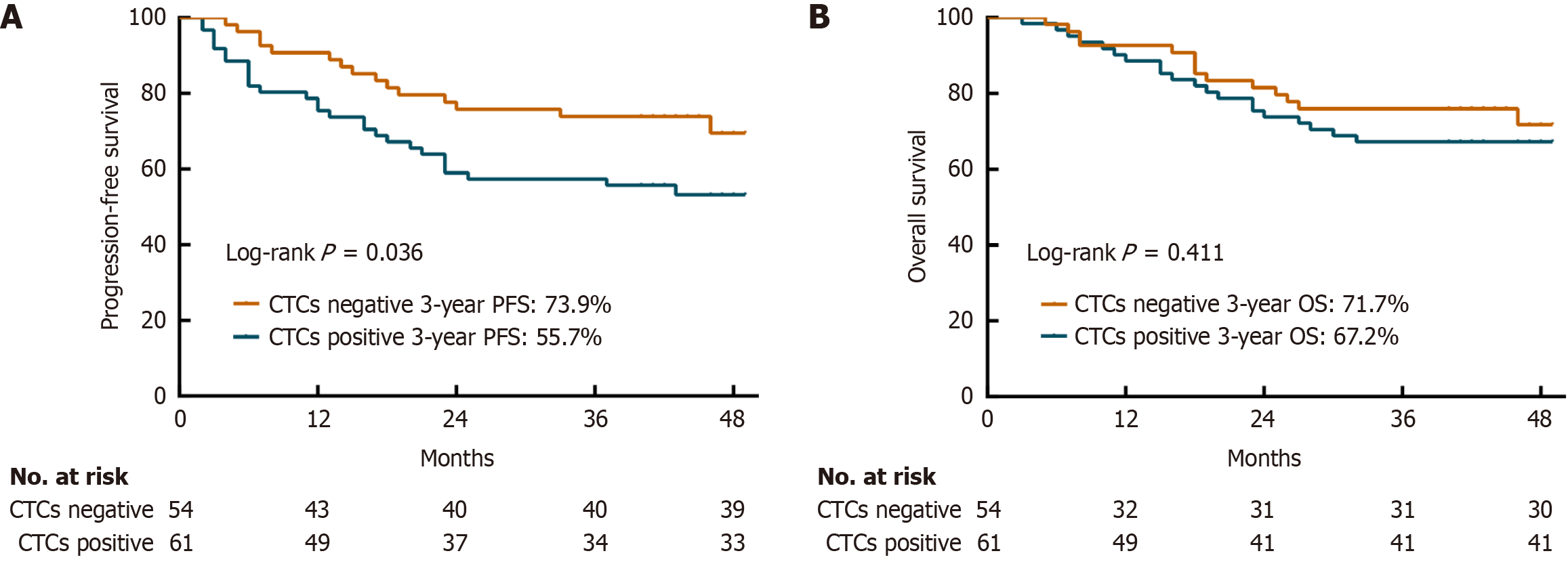 A: Circulating tumor cells (CTCs)-negative group; B: CTCs-positive group. CTCs: Circulating tumor cells.