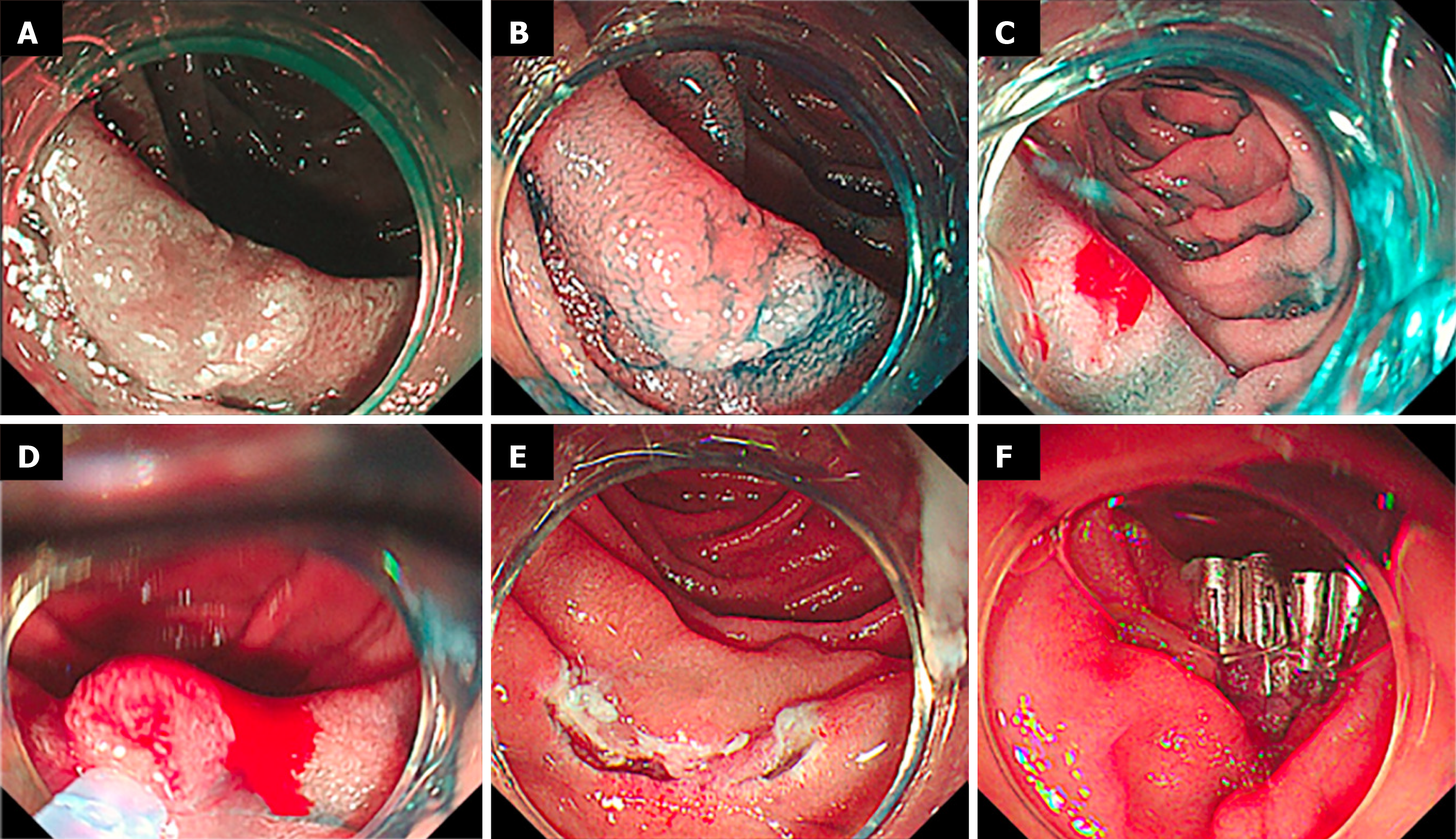 0-IIc lesion, 6 mm × 5 mm, tubular adenoma, vertical margin (-), horizontal margin (-). A: Lesion in the descending duodenum; B: Indigo carmine delineated margins; C: Submucosal methylene blue saline injection; D: Snare ligation; E: Post- endoscopic mucosal resection ulcer; F: Complete clip closure.