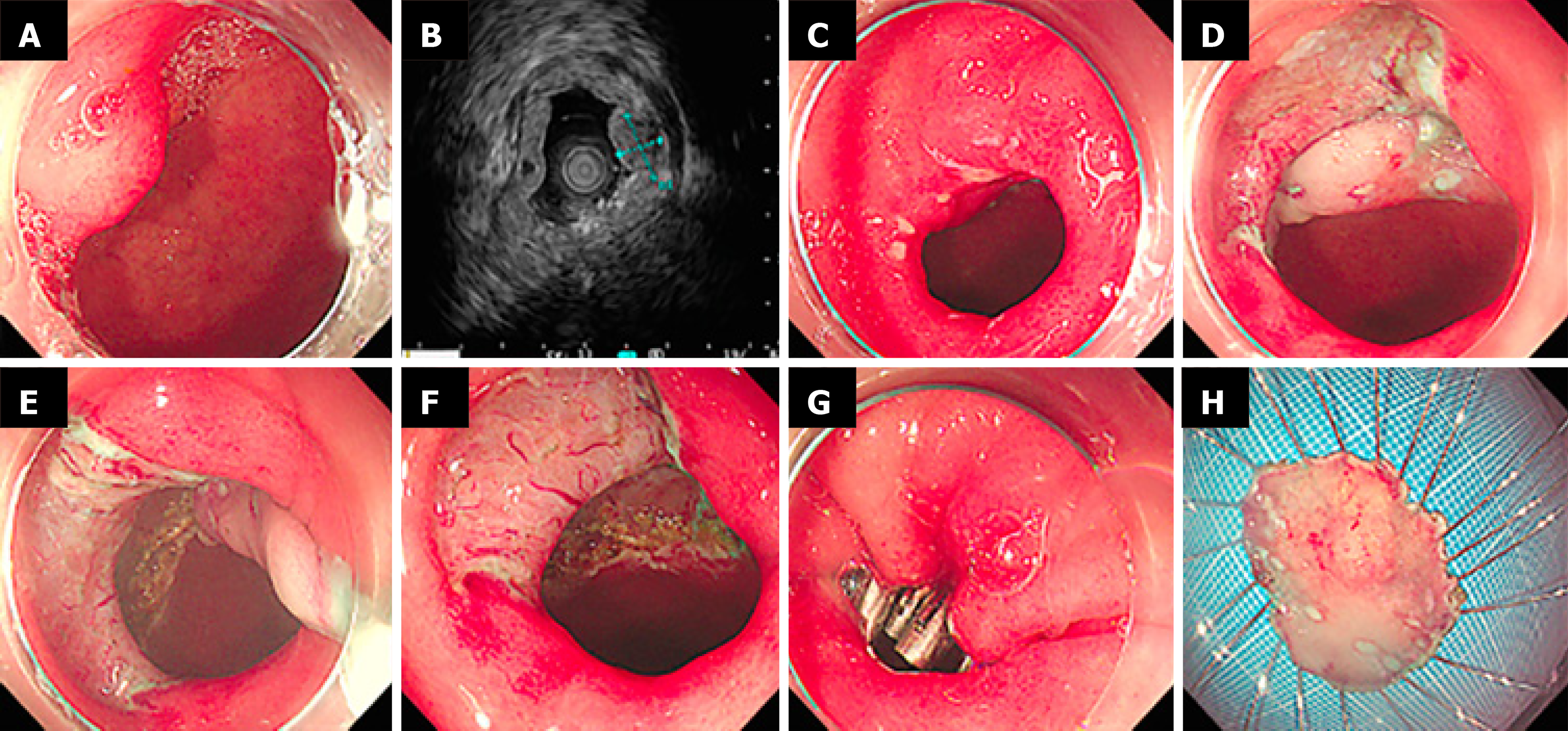 Submucosal tumor, 10 mm × 6 mm, neuroendocrine tumor G1, vertical margin (-), horizontal margin (-). A: Lesion in the bulb; B: Micro-probe endoscopic ultrasonography showed a hypoechoic lesion in the second layer; C: Marking; D and E: Dissection with golden knife; F: Post-endoscopic submucosal dissection ulcer; G: Clip closure; H: En bloc specimen.