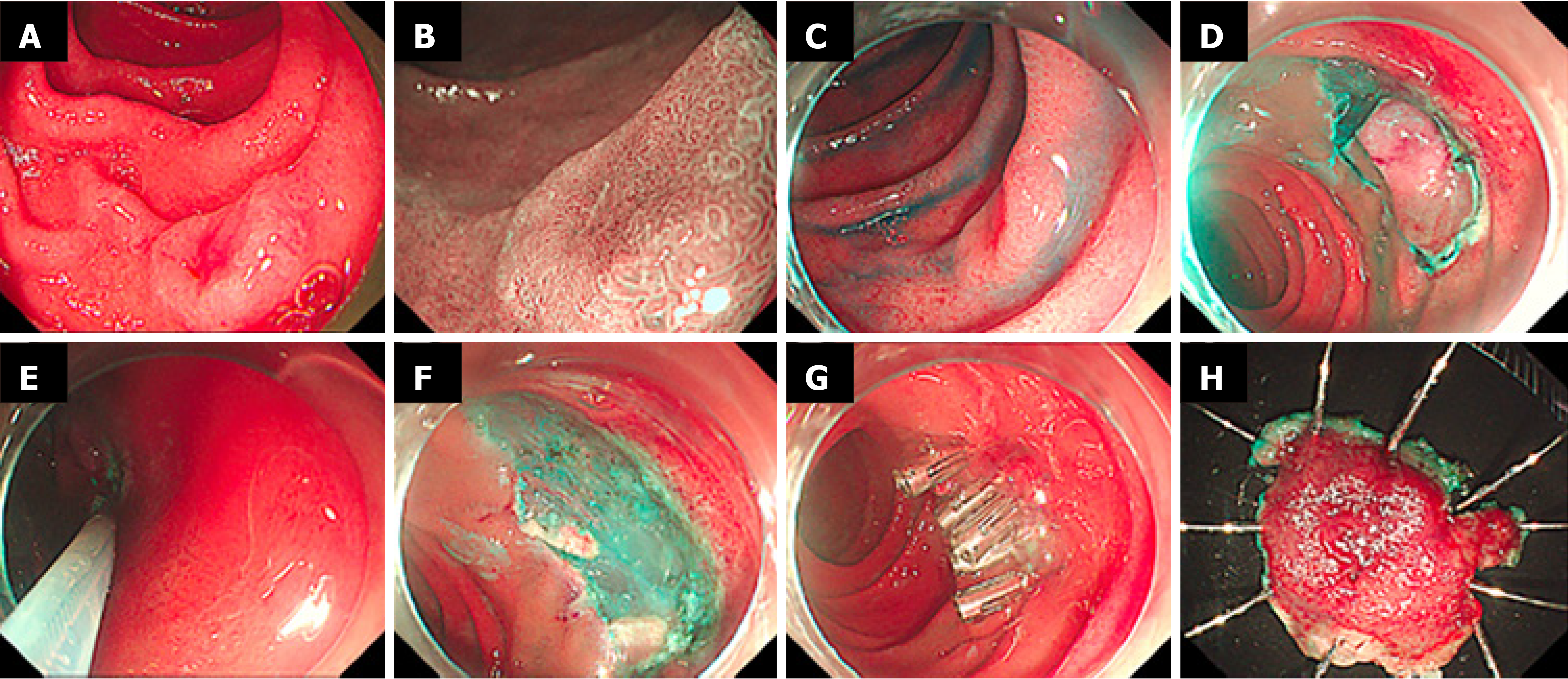 0-IIa lesion, 15 mm × 10 mm, mucosal carcinoma, vertical margin (-), horizontal margin (-). A: Lesion in the descending duodenum; B: Narrow band imaging revealed irregular microvascular and microsurface patterns; C: Injection after marking; D and E: Circumferential incision and submucosal dissection with golden knife; F: Post-endoscopic submucosal dissection ulcer; G: Clip closure; H: En bloc specimen.