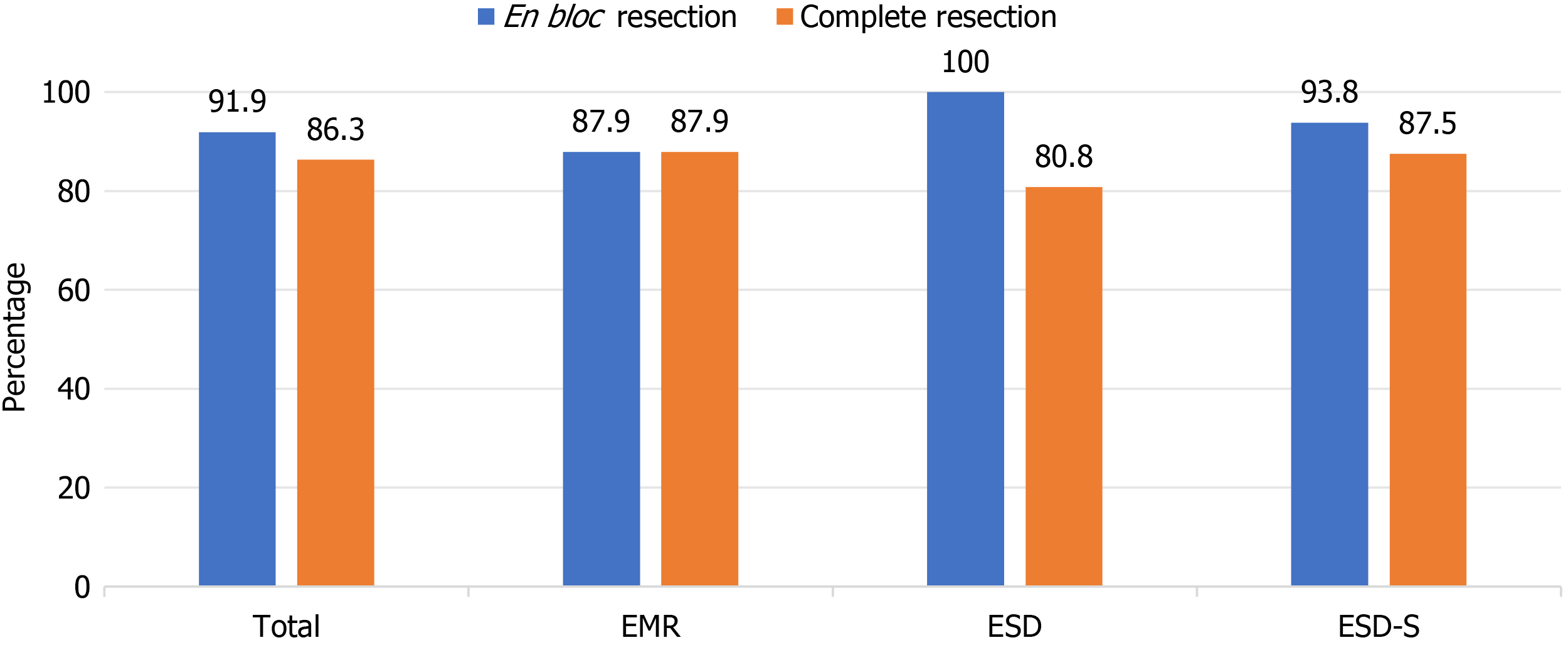 Figure 6 En bloc and complete resection rates across endoscopic resection groups.